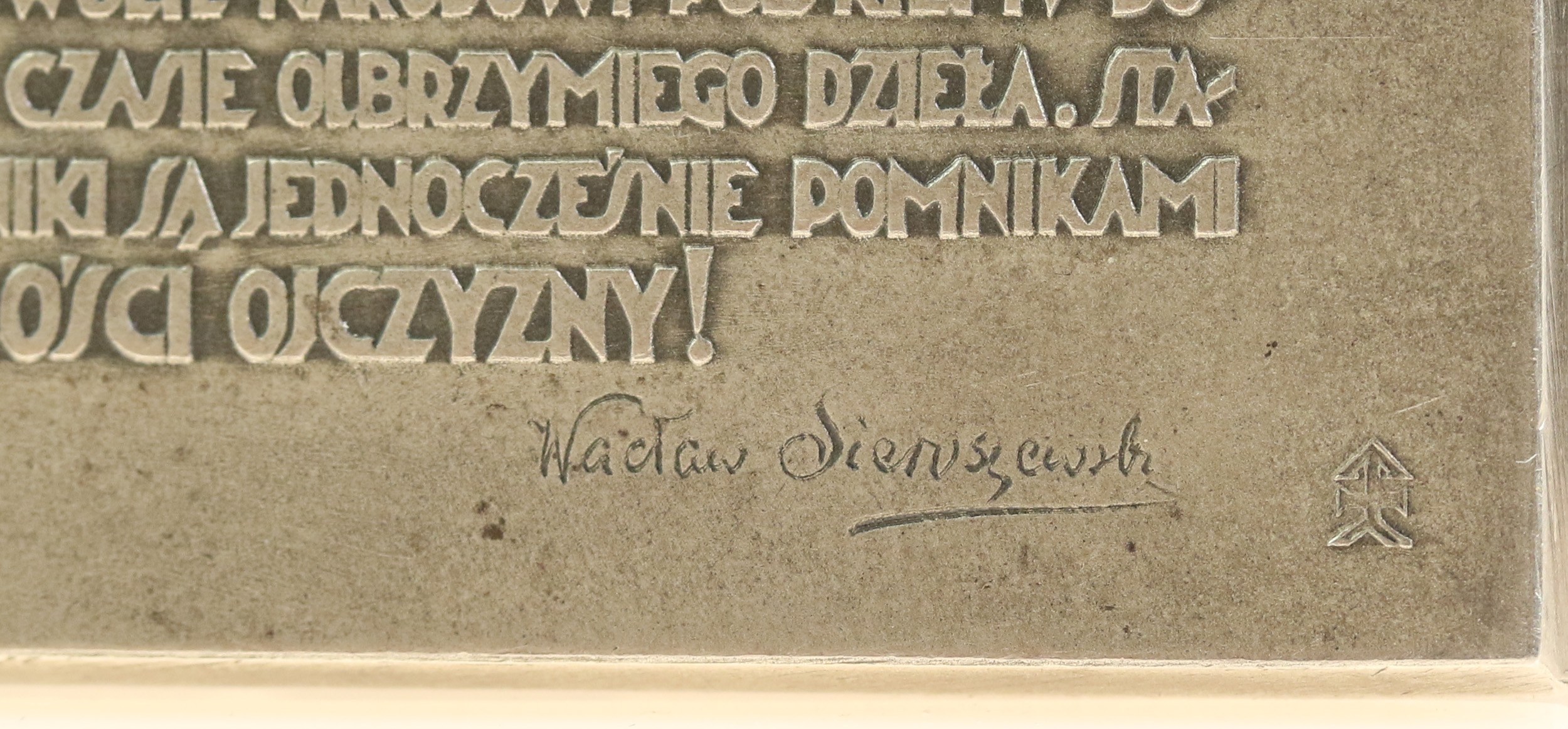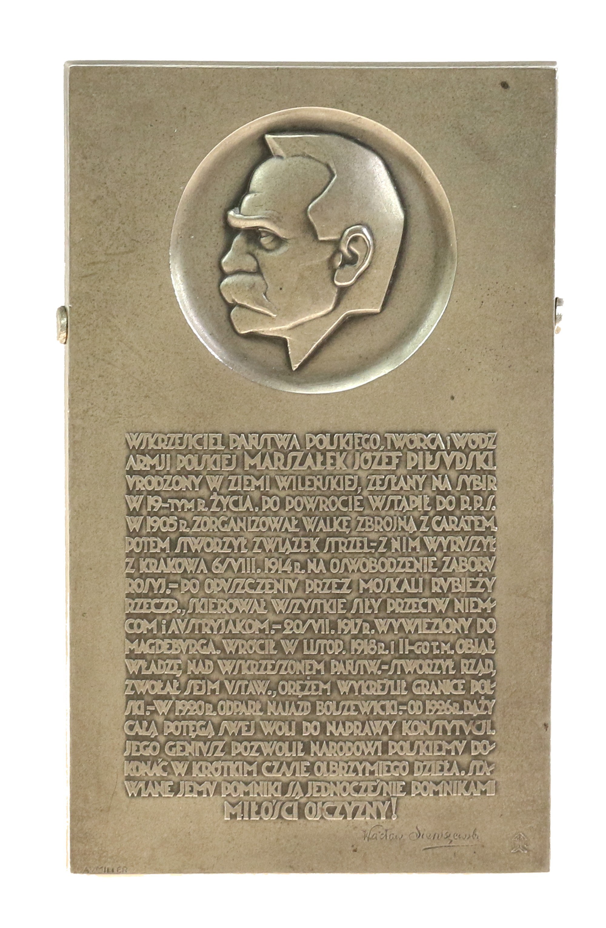 Bardzo rzadka plakieta wykonana w wersji luksusowej ze srebra próby 0.925 w Mennicy Państwowej w 1931 r. Plakieta w kształcie prostokąta, na awersie w górnej części plakiety widoczny lewy profil Marszałka Józefa Piłsudskiego wpisany w okrąg. Poniżej tekst autorstwa Wacława Sieroszewskiego. W prawym dolnym rogu widoczna sygnatura projektanta, (J.Aumillera), w lewym dolnym rogu znak Mennicy Państwowej oraz podpis Wacława Sieroszewskiego. Na rewersie plakiety cecha srebra Ag 0.925 oraz punca z herbem Kościesza znakiem Mennicy Państwowej. Dodatkowo widoczna srebrzona klamra wraz z podpórką.