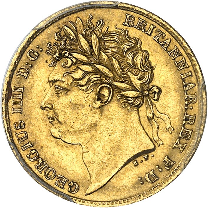 Av. GEORGIUS IIII D: G: - BRITANNIAR: REX F: D:. Buste à gauche de Georges IV, au-dessous signature B. P.