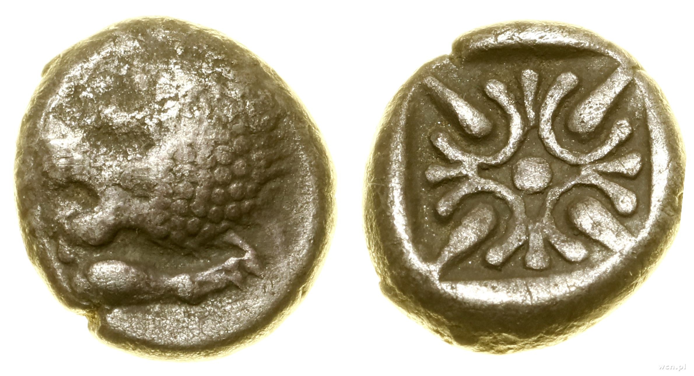 Aw: Głowa lwa w lewo, Rw: Ornament w formie czterolistnego kwiatu wewnątrz kwadratu incusum