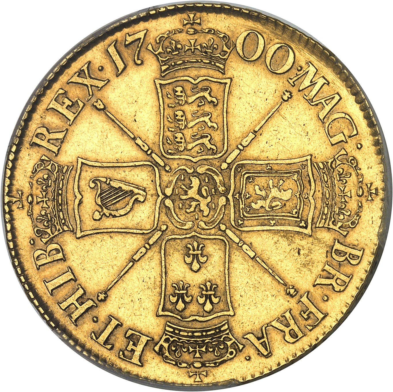 Rv. MAG. BR. FRA. ET. HIB. REX (date). Croix formée de quatre écus couronnés, avec armes en cœur, et cantonnée de quatre sceptres.