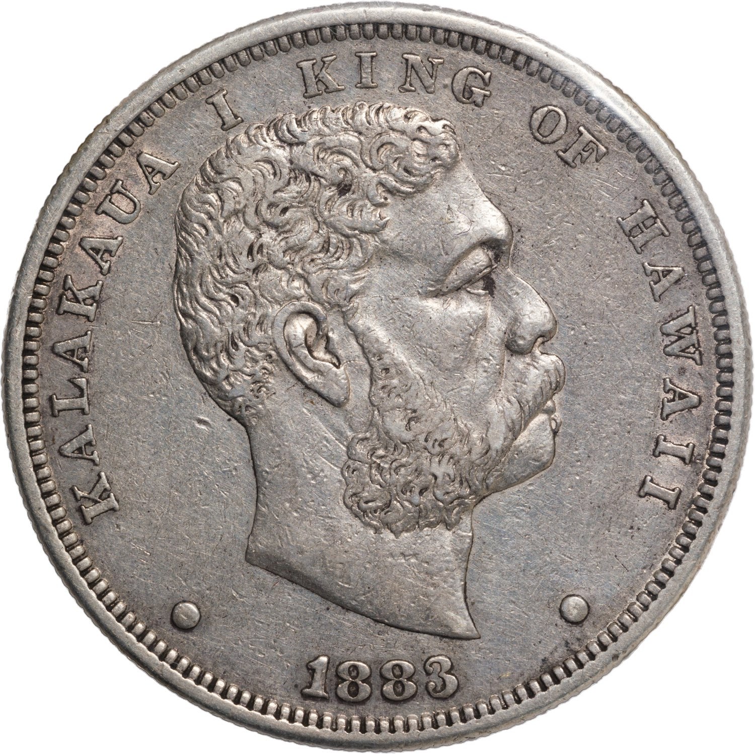 Hawaii, Regno. Kalakaua I. 1874-1891. AR Akahi Dala (1 dollaro) (26,60 g, 6 ore). Menta di Filadelfia. Datato 1883. KALAKAUA I RE DELLE HAWAII • 1883 •, testa di Kalakaua I a destra / UA MAU KE EA OKA AINA I KA PONO., stemma incoronato e ammantato del Regno delle Hawaii; 1 D affiancato (segno di valore); AKAHI DALA in esergo. Breen 8035; KM7