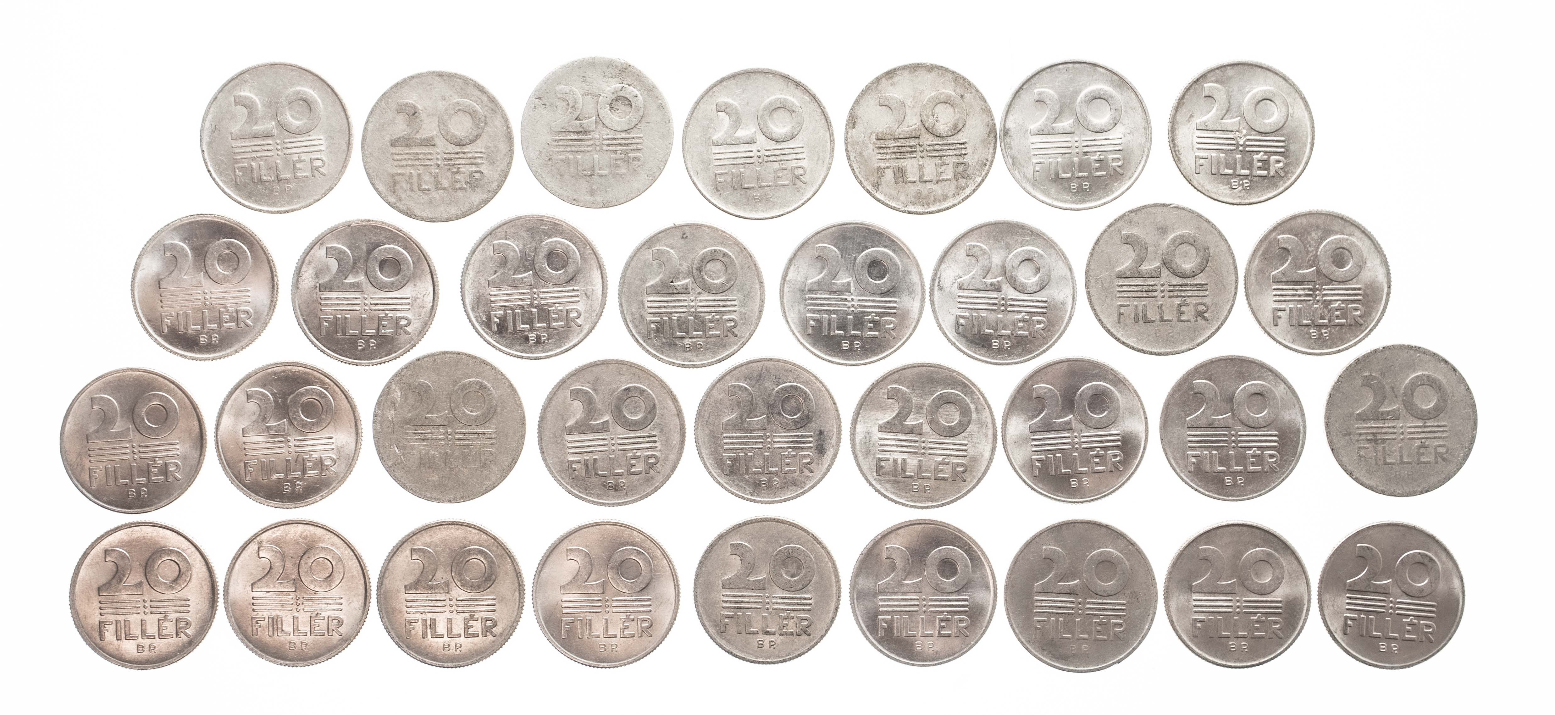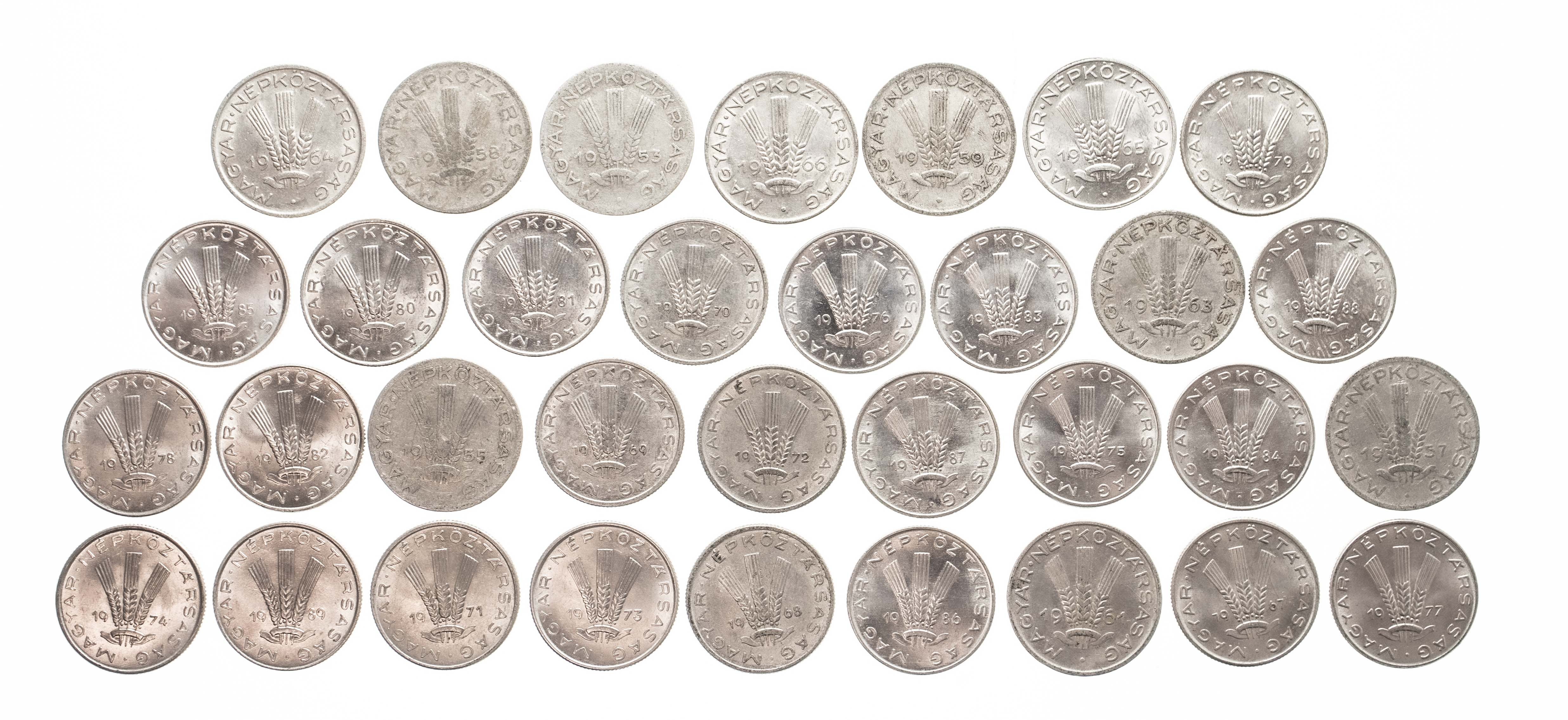 Węgry, zestaw monet obiegowych, 20 fillerów z lat 1953-1989 (33 sztuki).