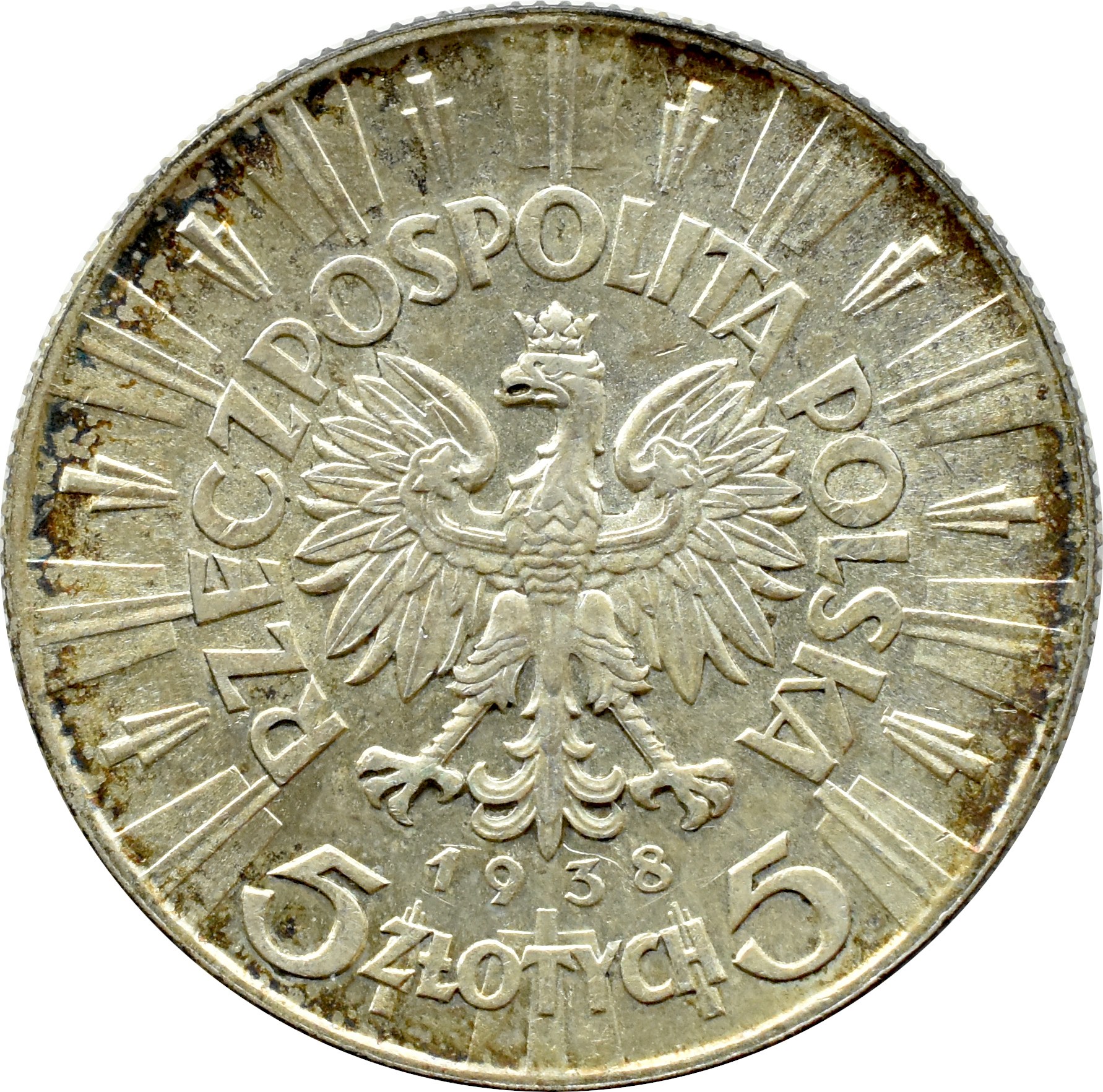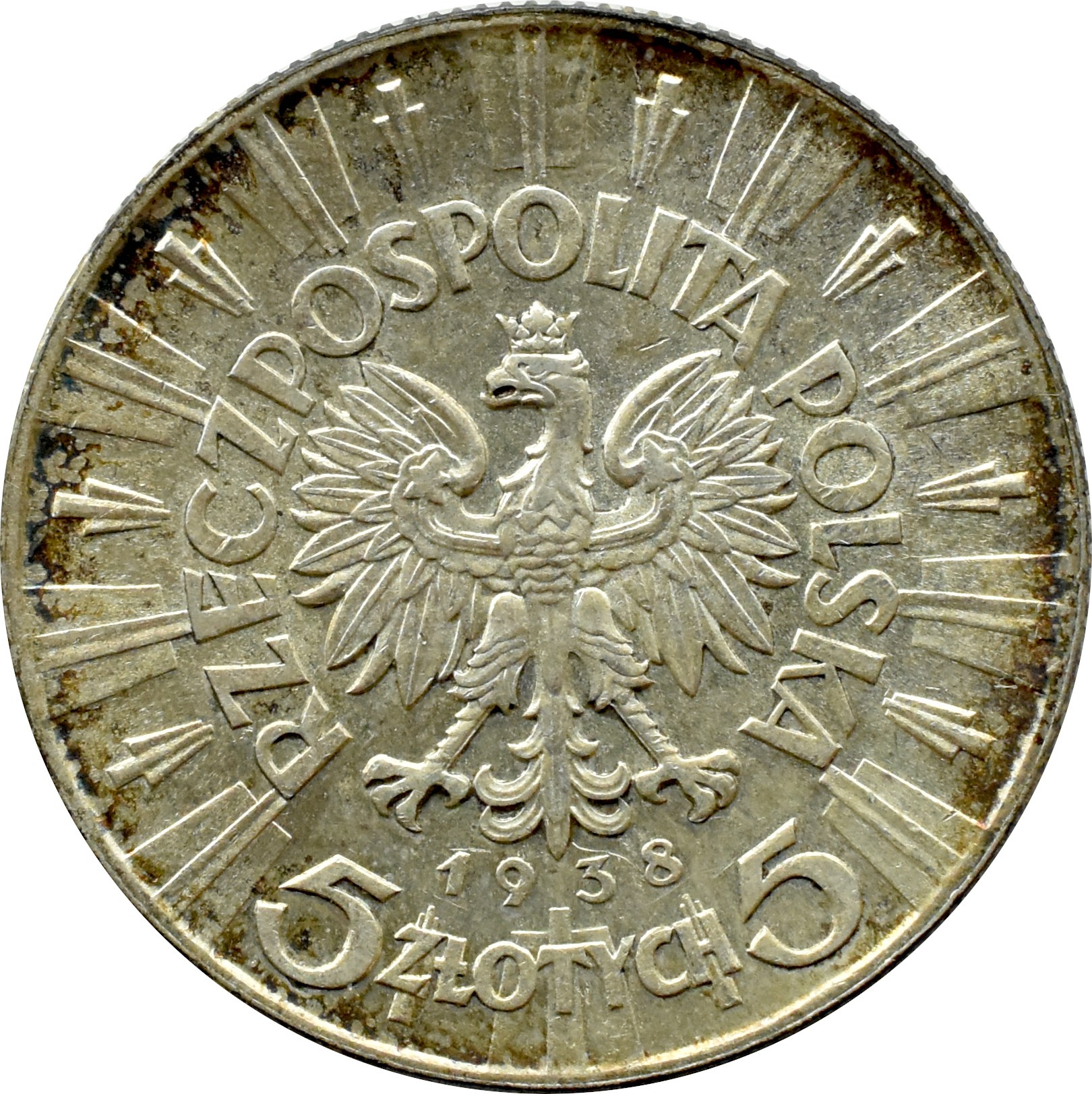 II RP (1918-1939), Józef Piłsudski, 5 złotych 1938, mennica Warszawa, PIEKNE