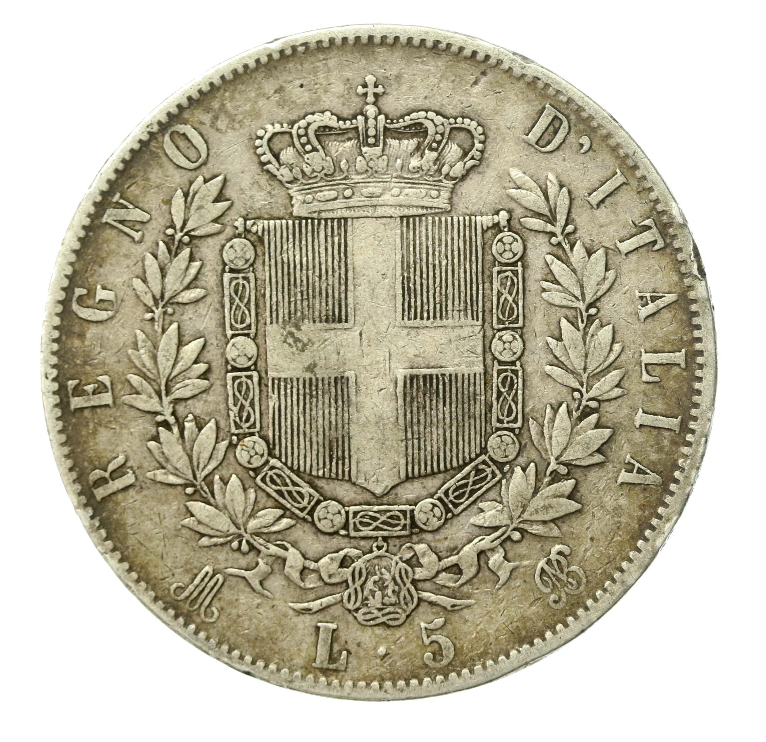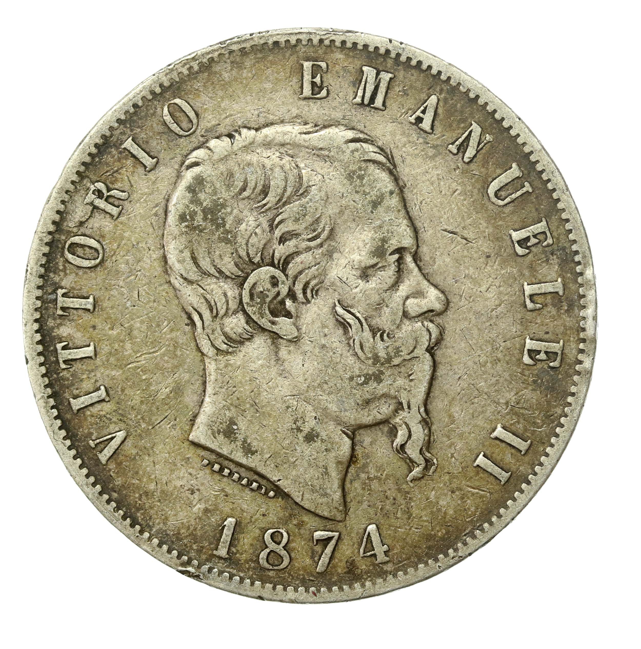 Włochy, Wiktor Emanuel II, 5 lirów 1874 M, Milan. Srebro próby 900. Waga katalogowa 25g. Literatura: KM 8