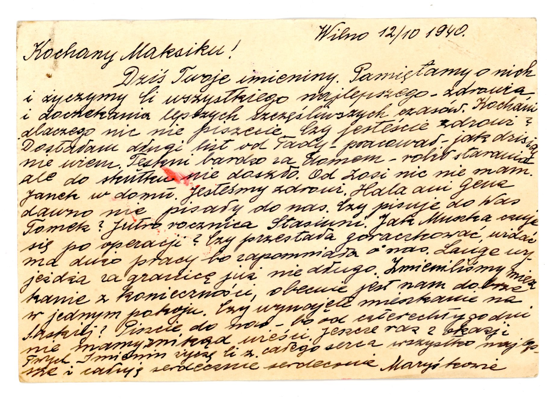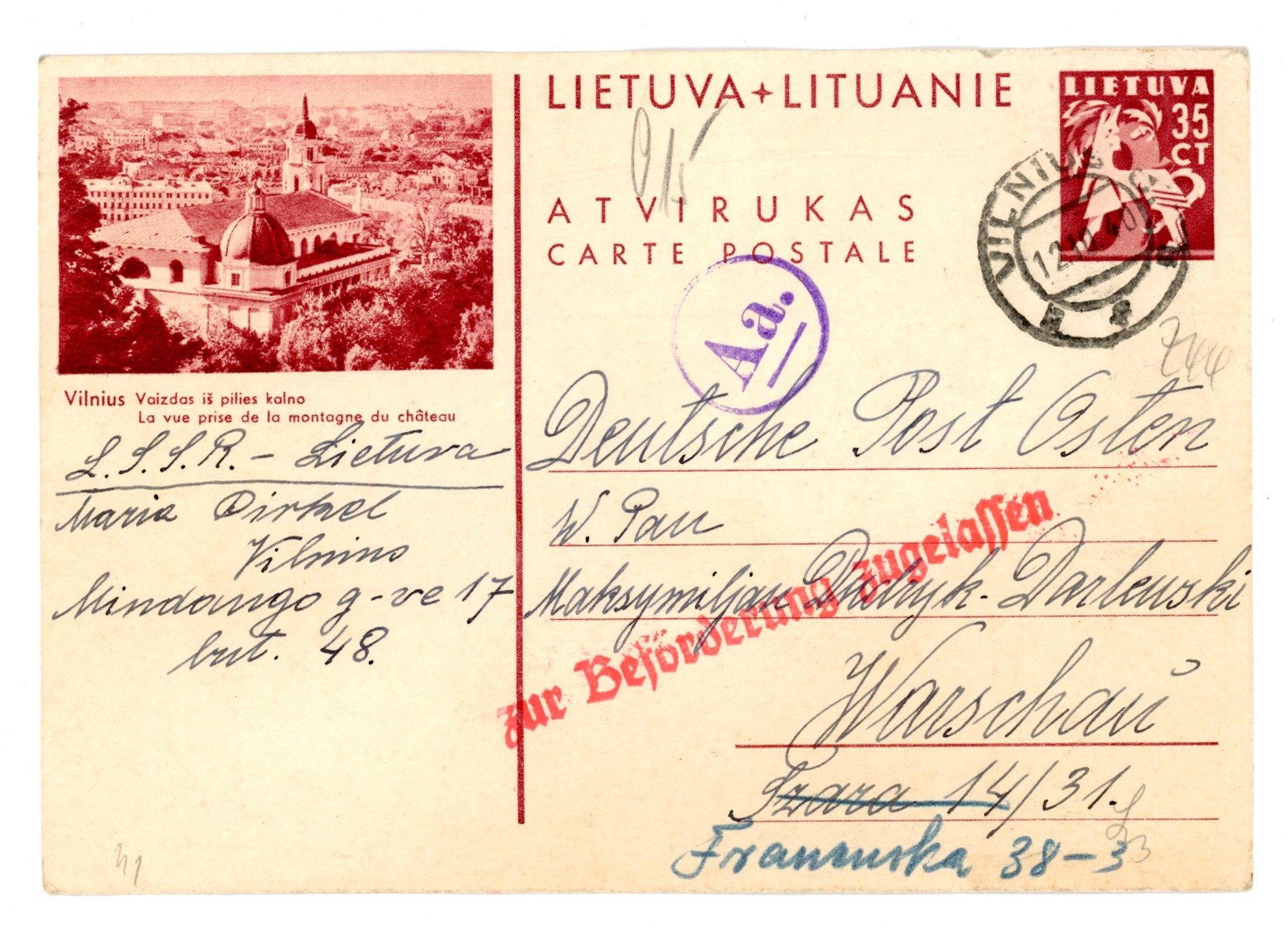 Całostka z okupowanej Litwy pisana przez Polaka i wysłana w 1940 r. z Wilna do Warszawy
