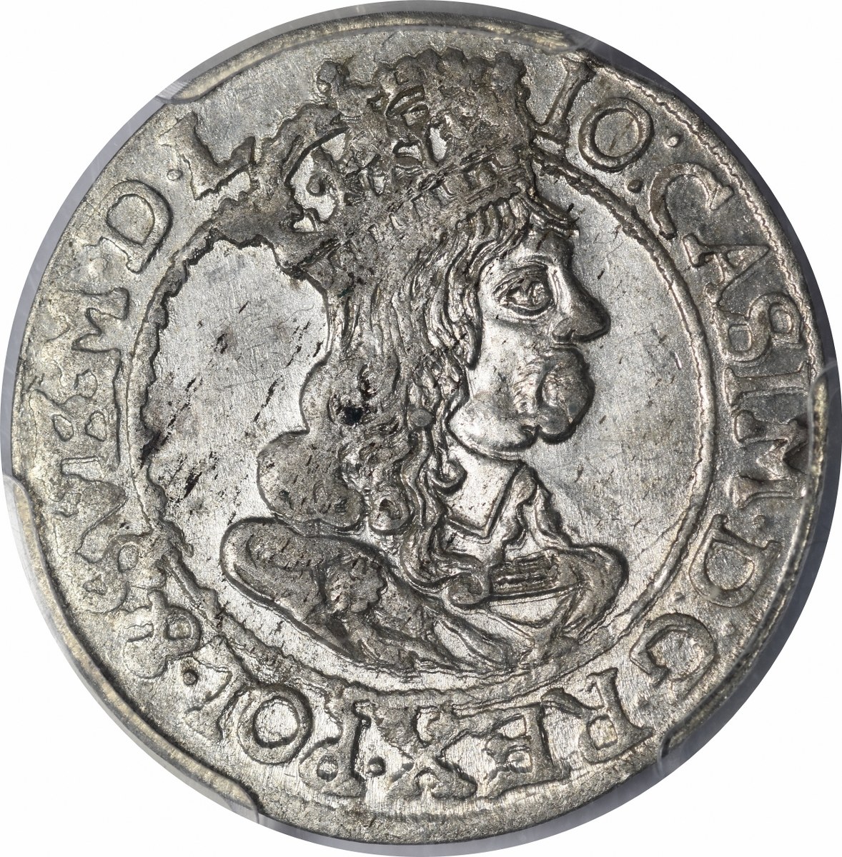 Odmiana napisowa z tytulaturą króla IO CASIM … w otoku na awersie oraz GROS AR SEX – REG POL