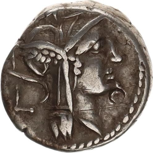 Denár, hlava Romy vpravo, za ní písmeno V (K?) / Viktoria na biz e D SILANVS LF/ROMA Ceaw. 337/3 3,813 g