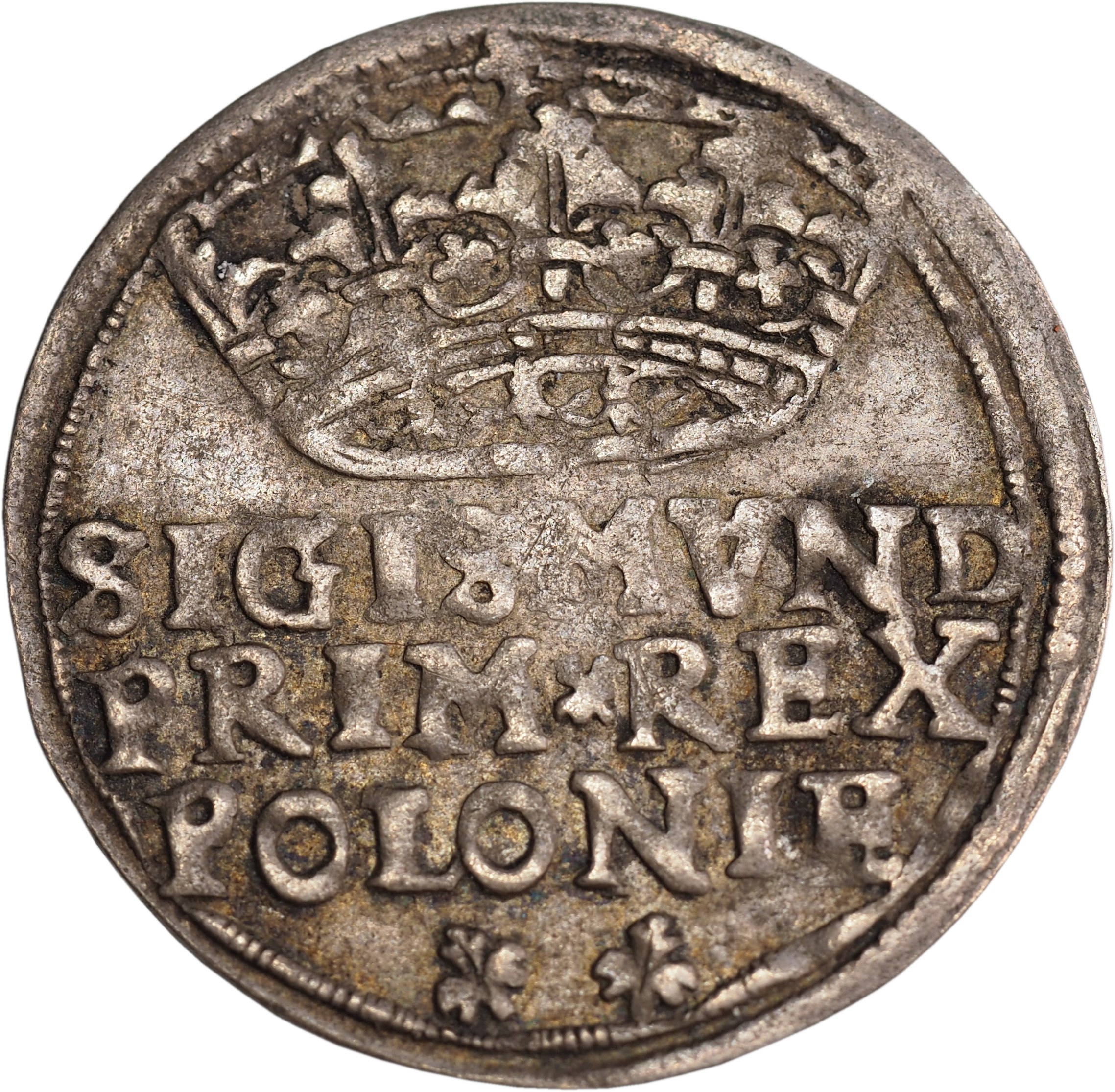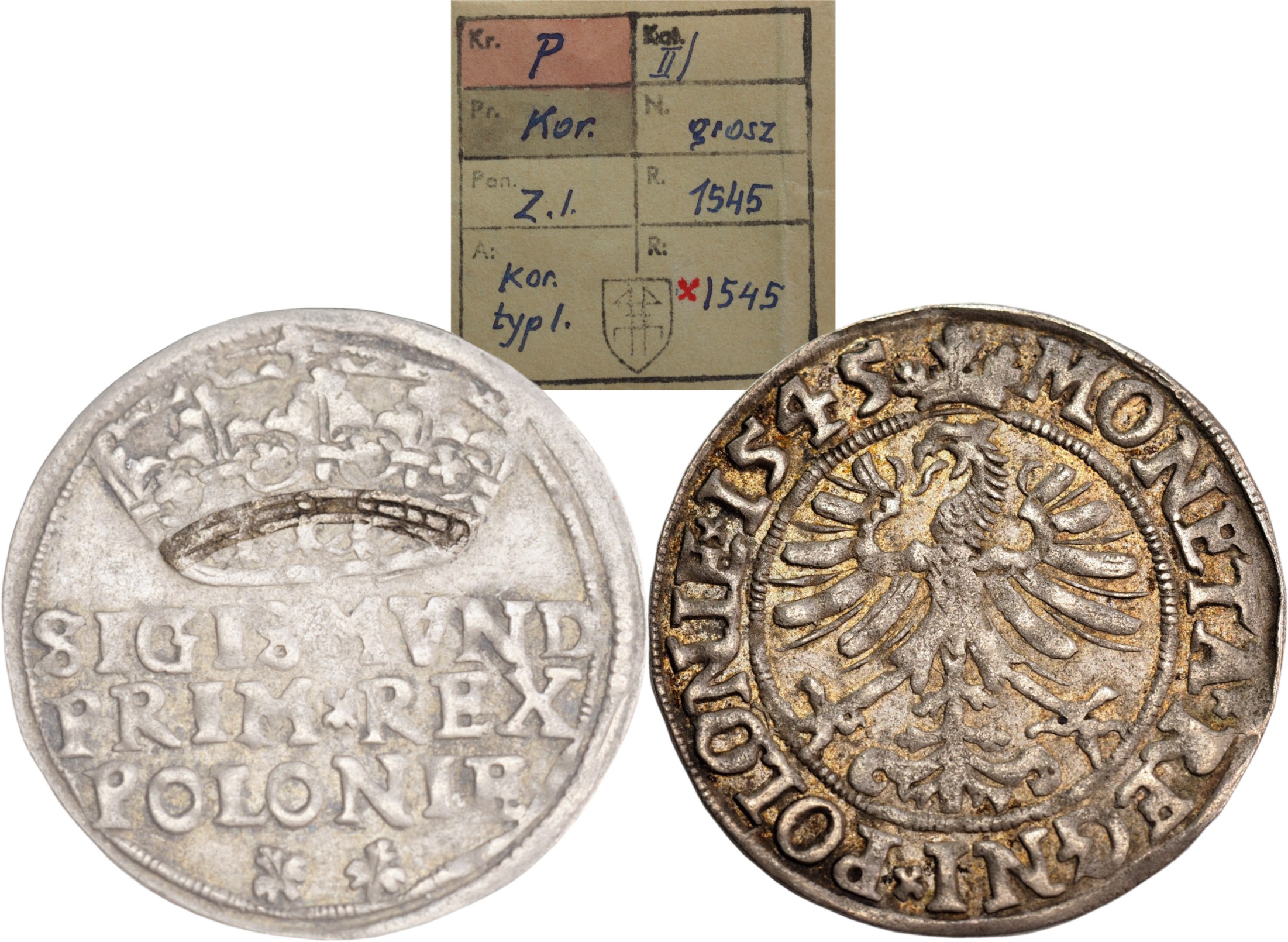 Rzadszy, późny rocznik grosza koronnego Zygmunta Starego.