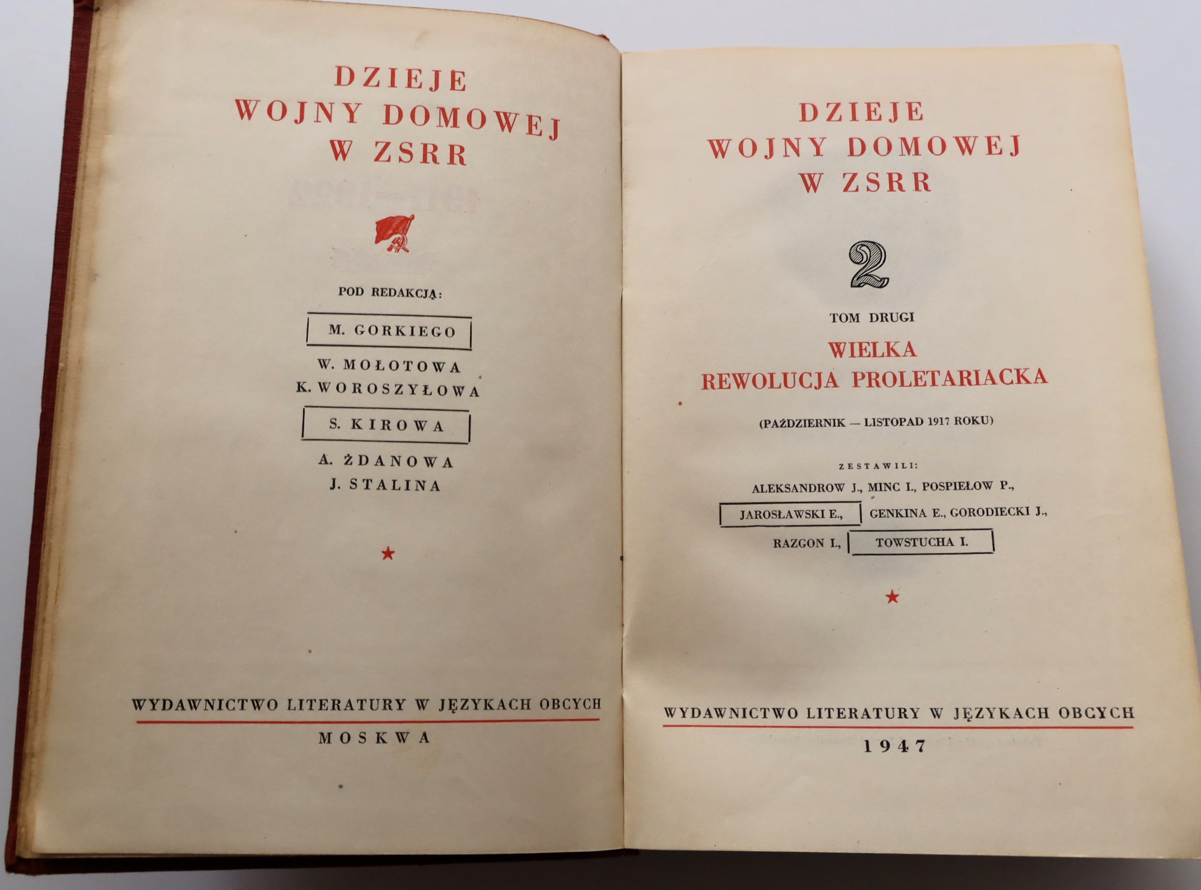 Wydawnictwo Literatury w językach obcych. Moskwa 1947, pod red. M.GORKIEGO, W. MOŁOTOWA, K. WOROSZYŁOWA i innych, s. 618, [1], wym. 14,5 x 22,5, oprawa twarda płócienna. Stan: zagięcia narożników okładki, nieznaczne zagięcie narożnika bloku, stan dobry. PROPAGANDA.