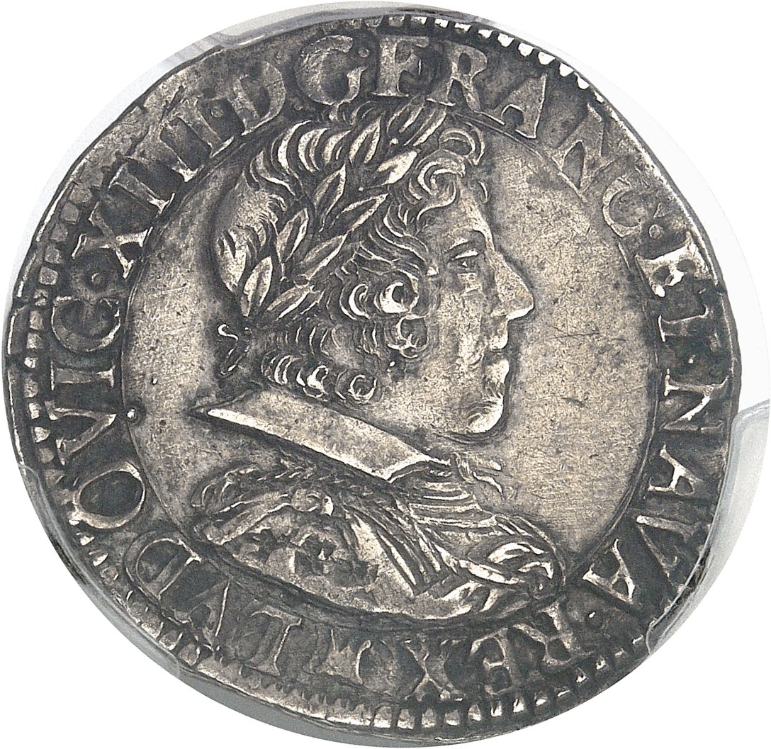 Av. LVDOVIC. XIII. D. G. FRANC. ET. NAVA. REX. Buste lauré, drapé et cuirassé à droite, avec col plat ; (atelier) à l’exergue.