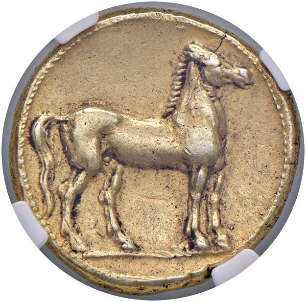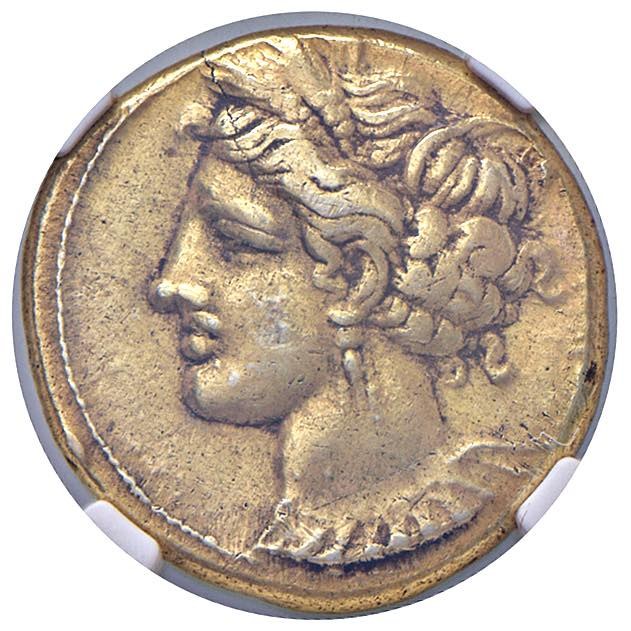 § ZEUGITANA Cartagine (320-280 a.C.) Statere - D/ Testa di Tanit a sx con capelli raccolti, indossa orecchini e collana a pendenti. R/ Cavallo a dx - AU (g 7,57) Strike: 5/5, Surface: 3/5. In slab NGC Ancients Ch VF n° 2149067-027.