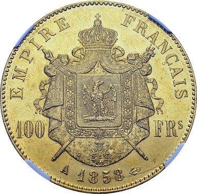 Napoléon III, 1852-1870. 100 Francs 1858 A, Paris. Gad. 1135; F. 550. AU. 32.26 g. 91'945 ex. NGC MS 63