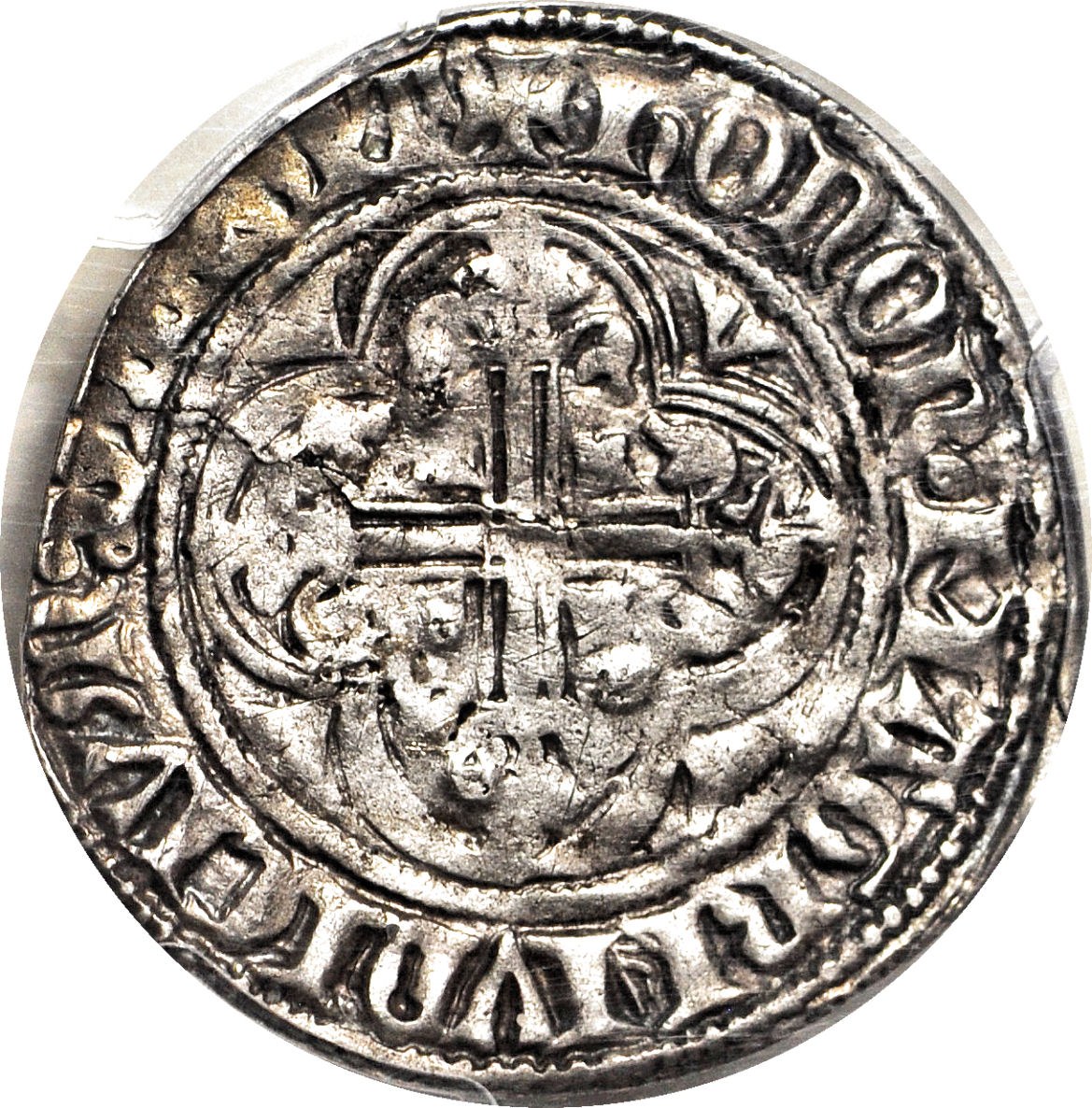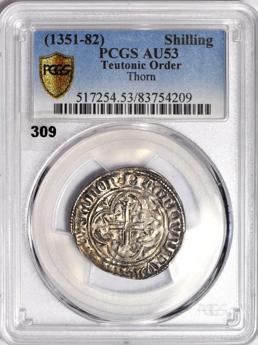 Rzadki nominał. W PCGS nie ma tego nominału w nocie MS. Na awersie tarcza Wielkiego Mistrza w sześciopłatkowej rozecie, na rewersie Krzyż z lilijkami w czteropłatkowej rozecie.
