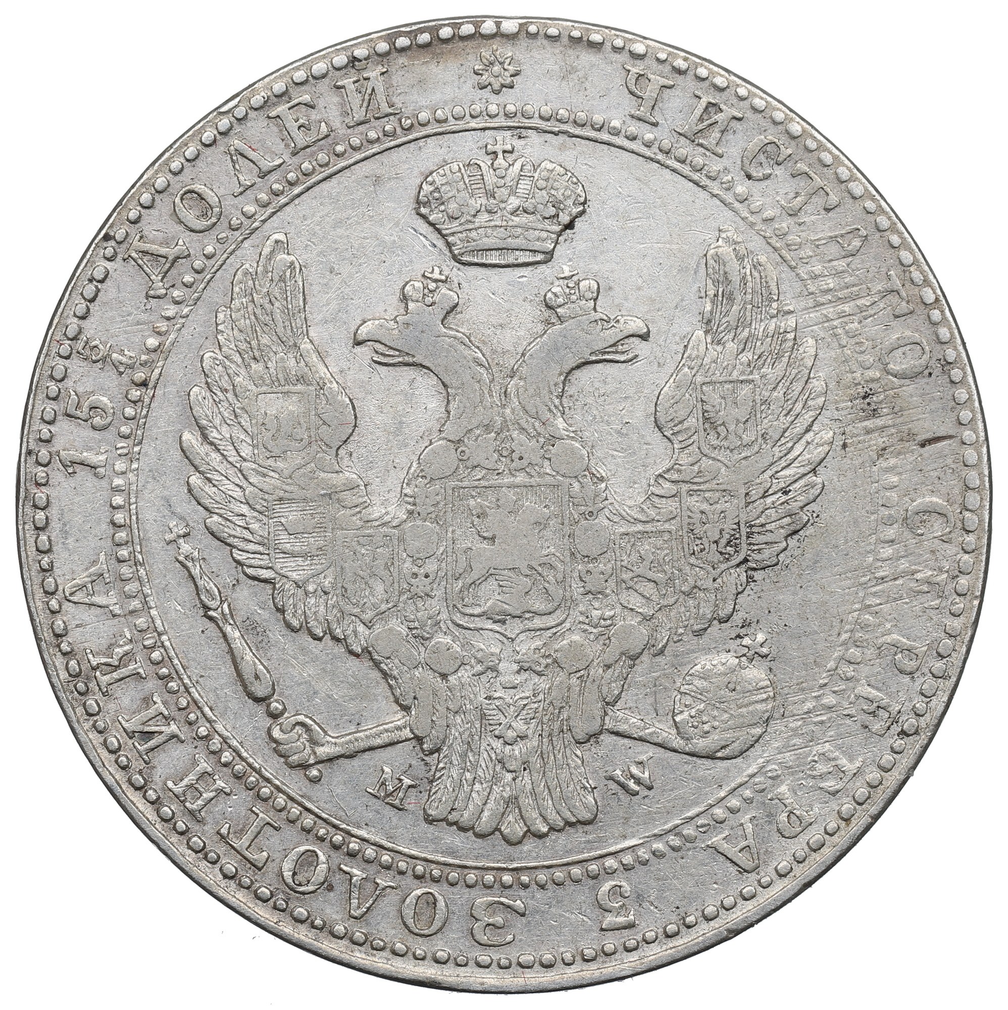 Awers: ukoronowany orzeł Imperium Rosyjskiego, po bokach jego ogona inicjały M-W, w otoku zewnętrznym legenda:
