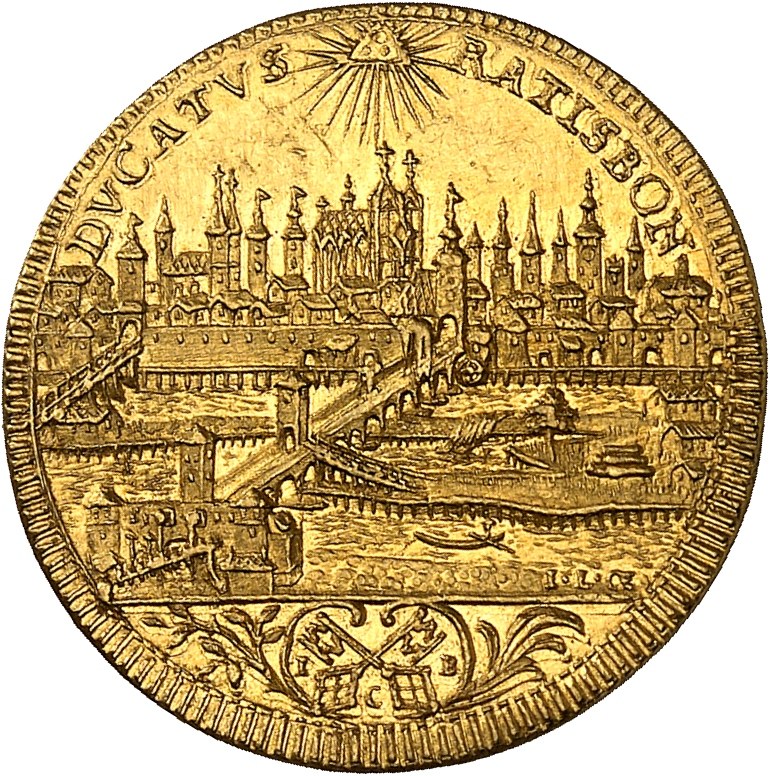 Rv. DVCATVS - RATISBON. Vue de la ville et du Danube, signatures ICB dans un cartouche et I. L. Œ.