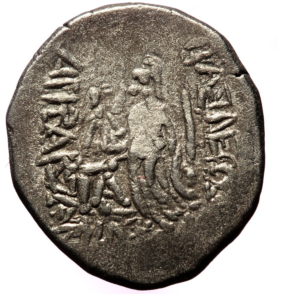 Rev.: ΒΑΣΙΛΕΩΣ ΑΡΙΟΒΑΡΖΑΝOY ΦΙΛΟΡΩΜΑΙOY, Athena standing left with right hand supporting spear and shield, and left hand outstretched supporting Nike left, holding wreath; monogram to inner left.