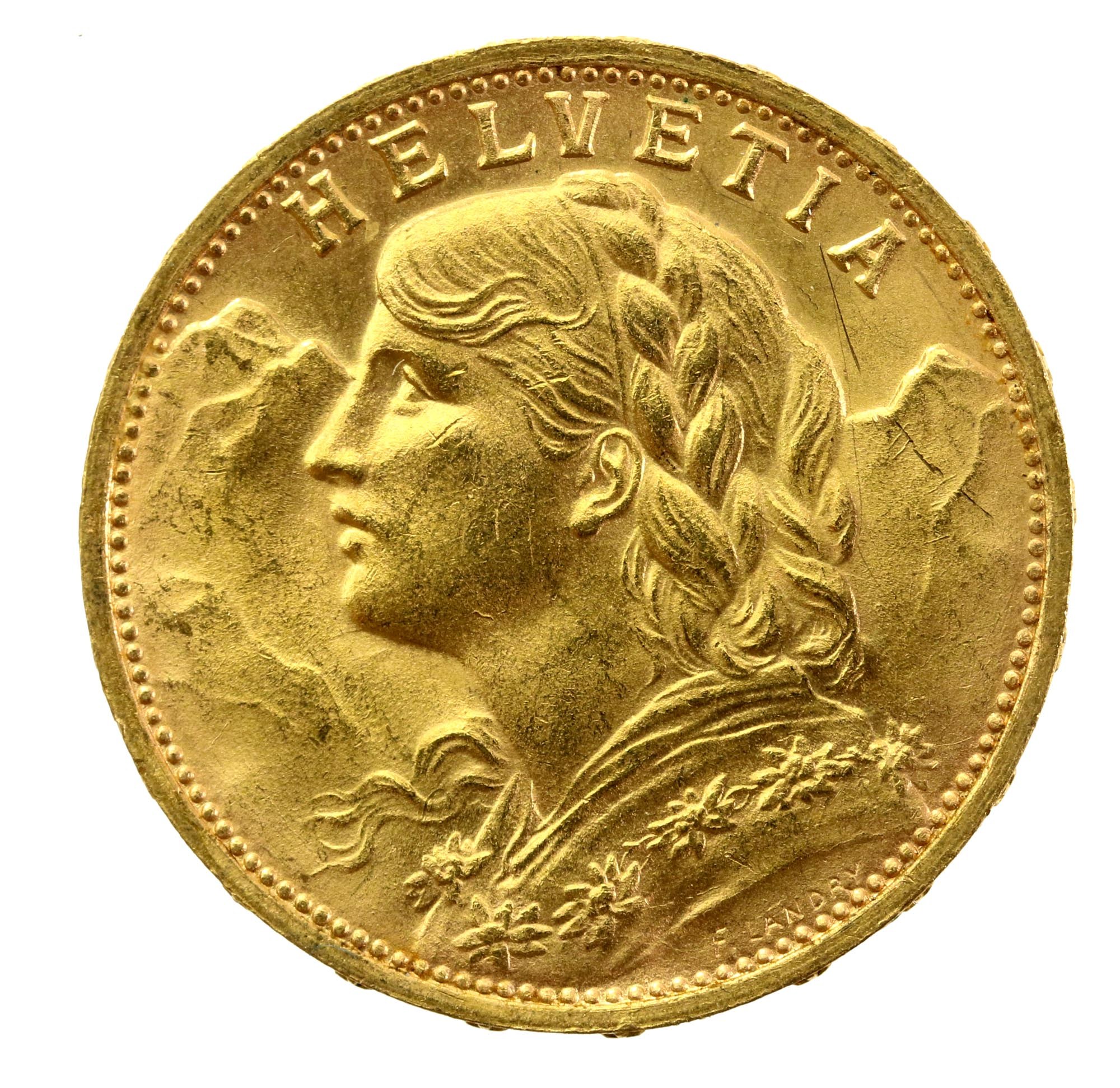 Szwajcaria, 20 franków 1927, Berno. Złoto próby