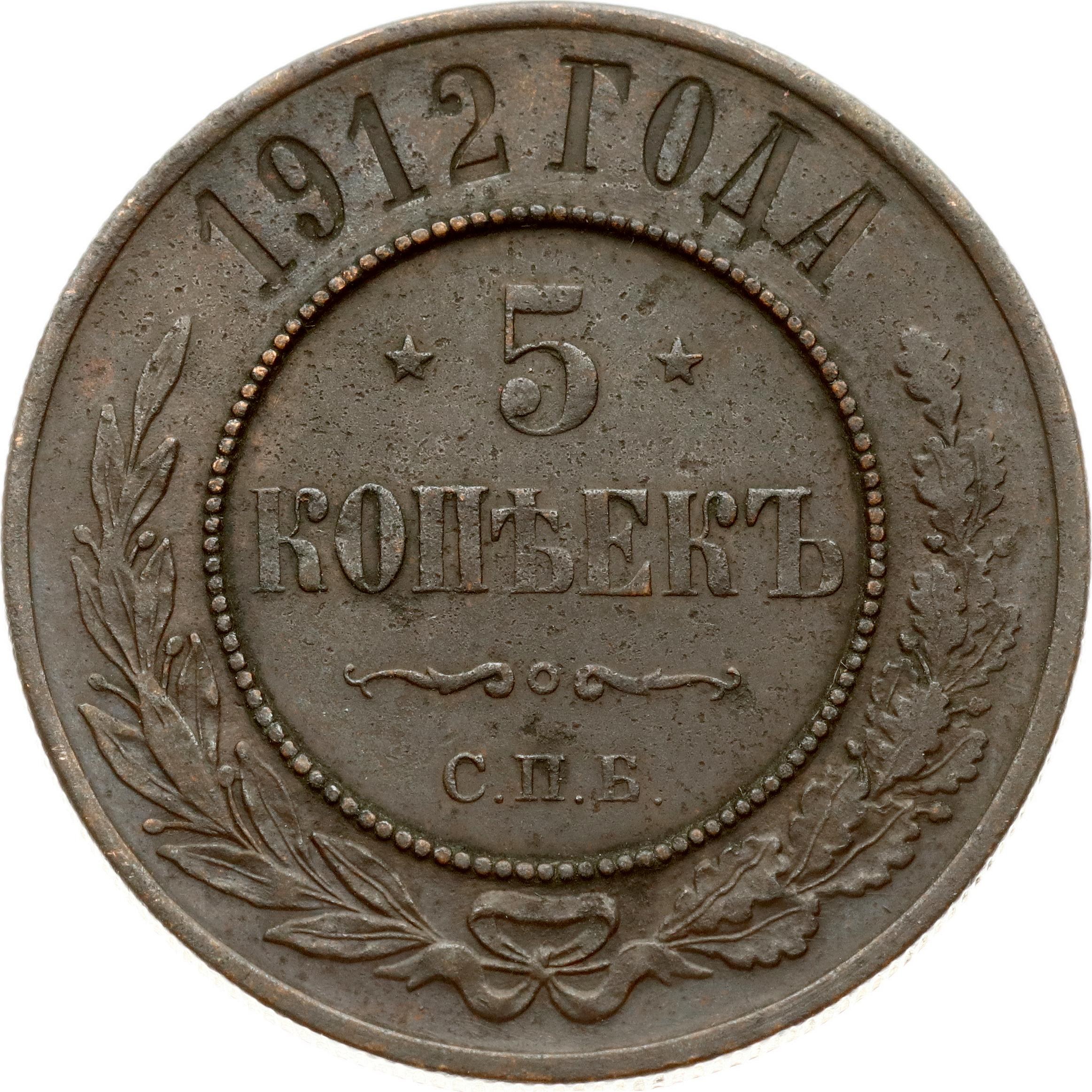 Russia. Nicholas II (1894-1917). 5 Kopecks 1912 СПБ, St. Petersburg. Copper 16.23 g. Bitkin 211.