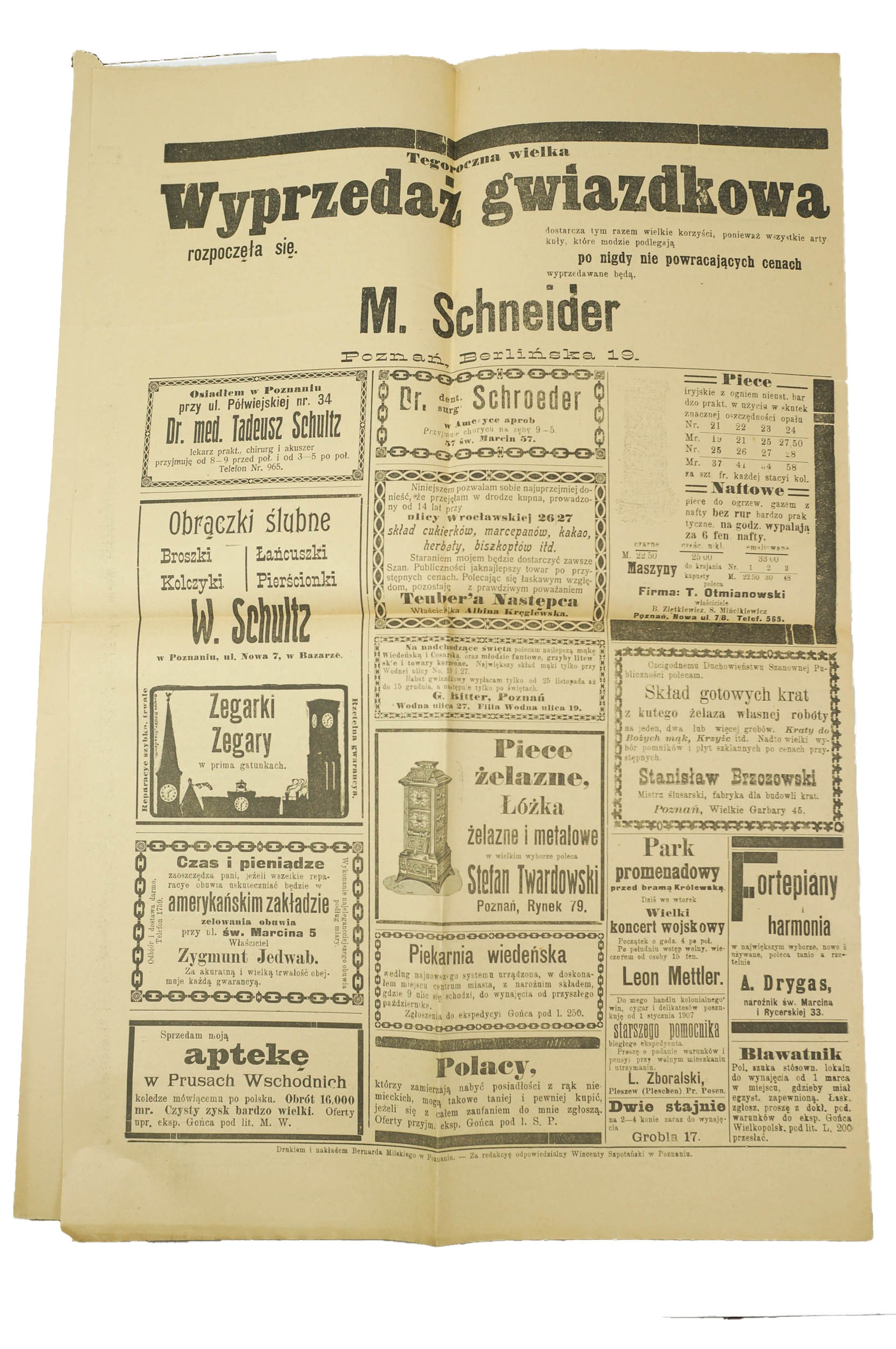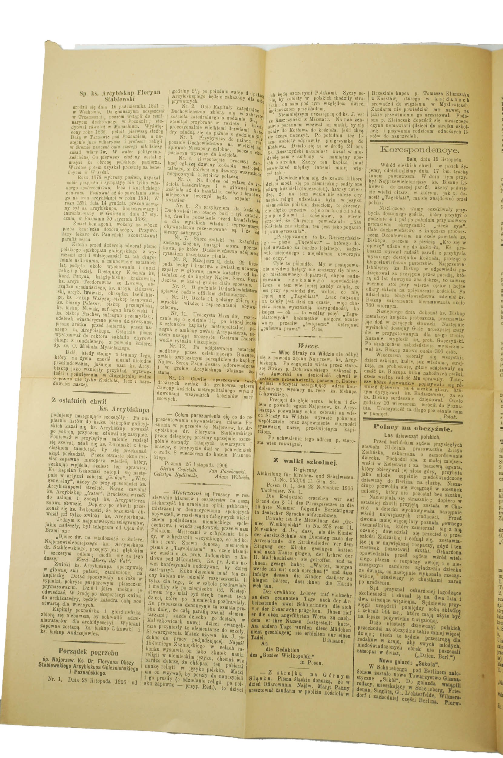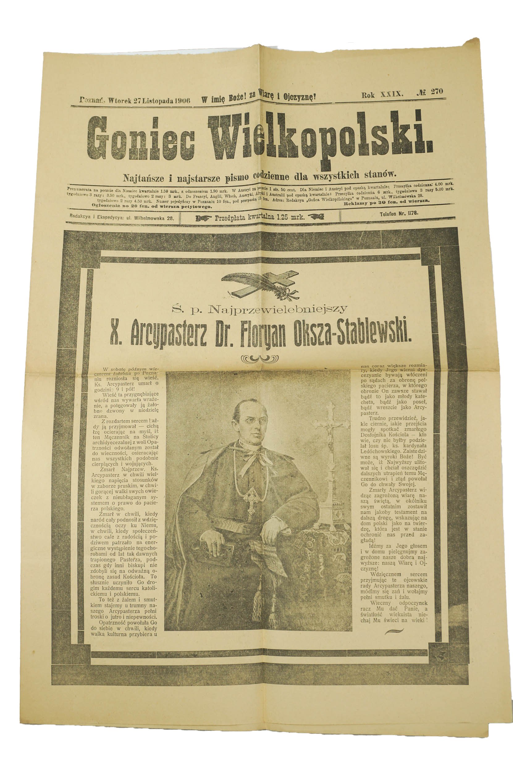 GONIEC WIELKOPOLSKI z dnia 27 listopada 1906 roku z klepsydrą i wspomnieniem Najprzewielebniejszego X. Arcypasterza Dr. Floriana Oksza-Stablewskiego na pierwszej stronie, poza tym inne artykuły i reklamy, f. 33 x 47,5cm, s. 4