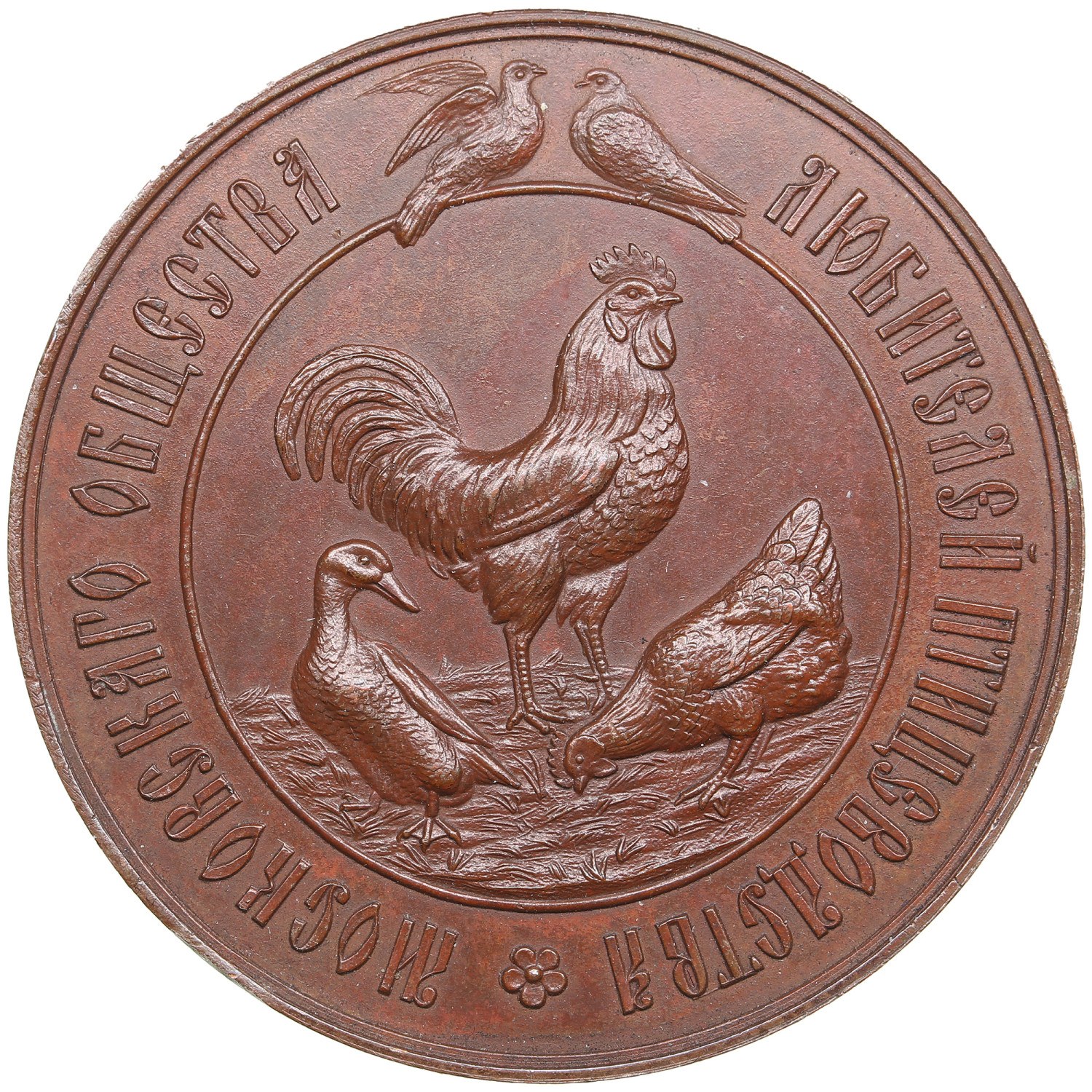 60.23g. 51mm. UNC/UNC. Although the medalier and mint remain unknown, the fine detail and well-balanced design suggest professional craftsmanship.Medalier: unsigned. Unknown manufacturer. Obv.: In the center – a detailed composition of five farm birds: three ground-dwelling poultry (two chickens and duck) and two doves in flight above.Inscription around: МОСКОВСКAГО ОБЩЕСТВА ЛЮБИТЕЛЕЙ ПТИЦЕВОДСТВА (Moscow Society of Poultry Breeding Enthusiasts). Rev.: Central circular field intended for engraving, surrounded by four decorative vegetal ornaments placed symmetrically around the border.Awarded for achievements in the field of poultry keeping, it reflects the rise of specialized agricultural societies in Russia before the 1917 revolution.