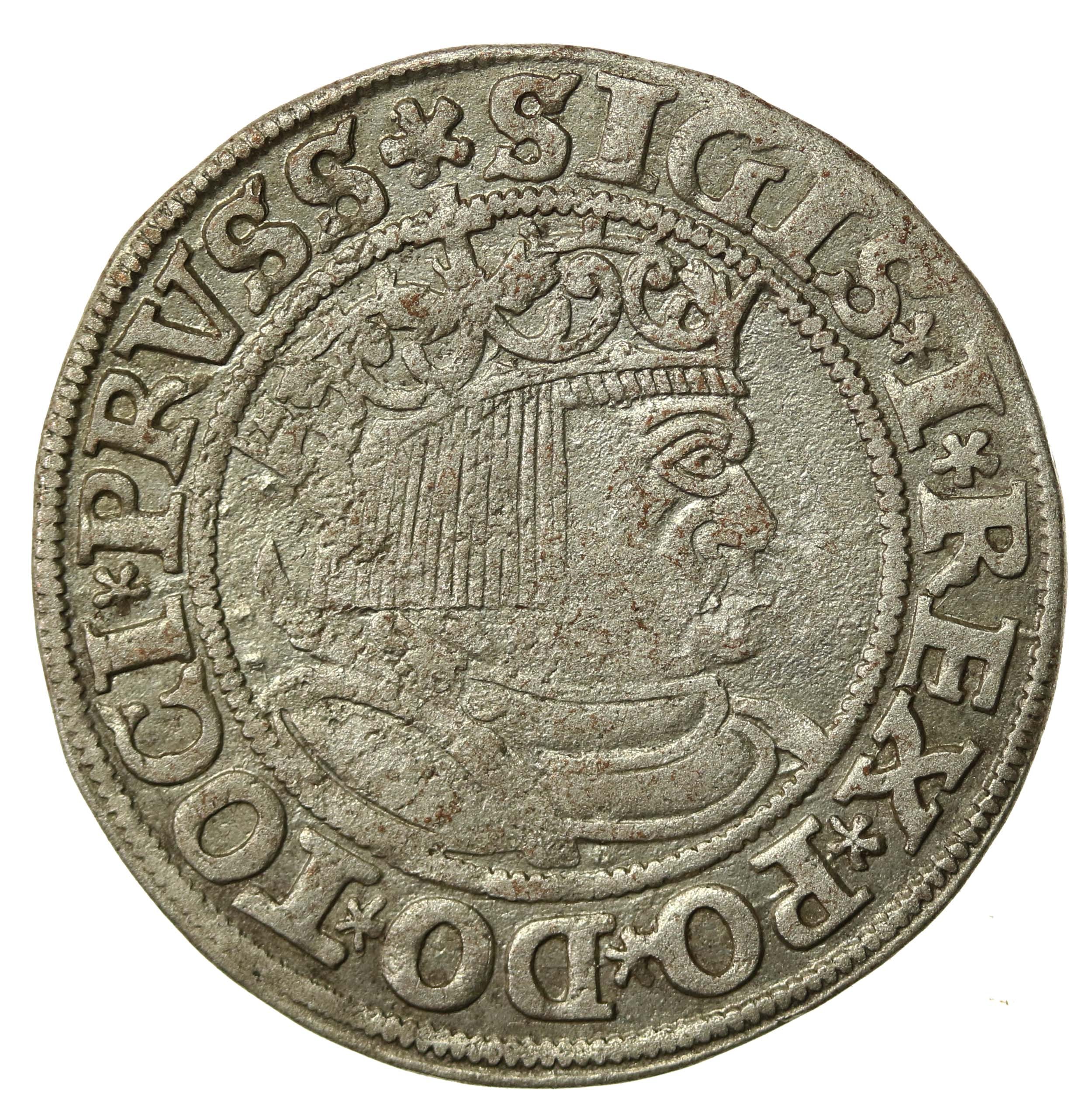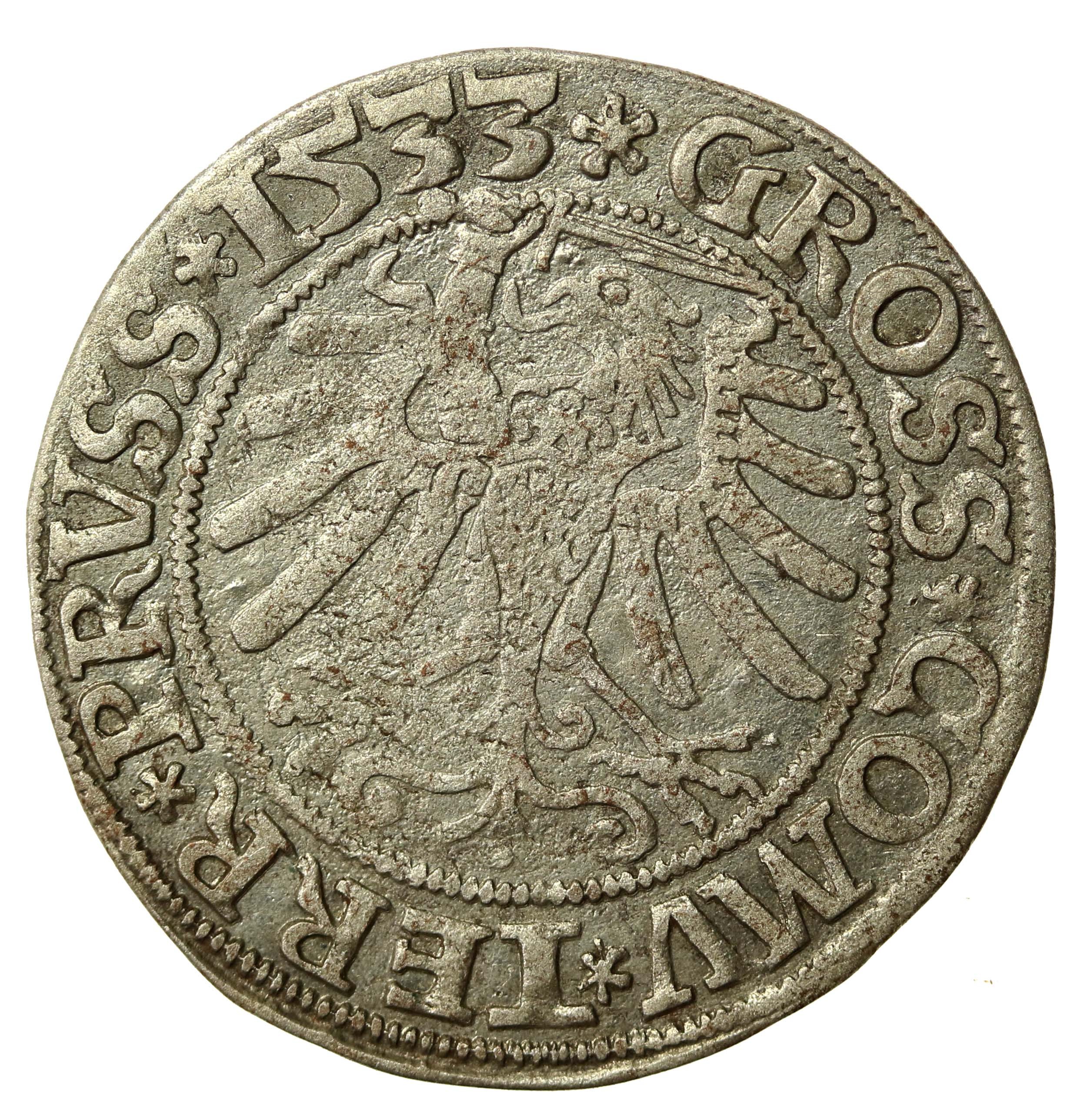 Zygmunt I Stary, grosz 1533, Toruń PRUS/PRUSSIE. Odmiana legendowa PRVSS / PRVSSIE. Stan 3+/2-. Dobrze zachowana moneta z mocnym połyskiem menniczym. Literatura: Kopicki 3088