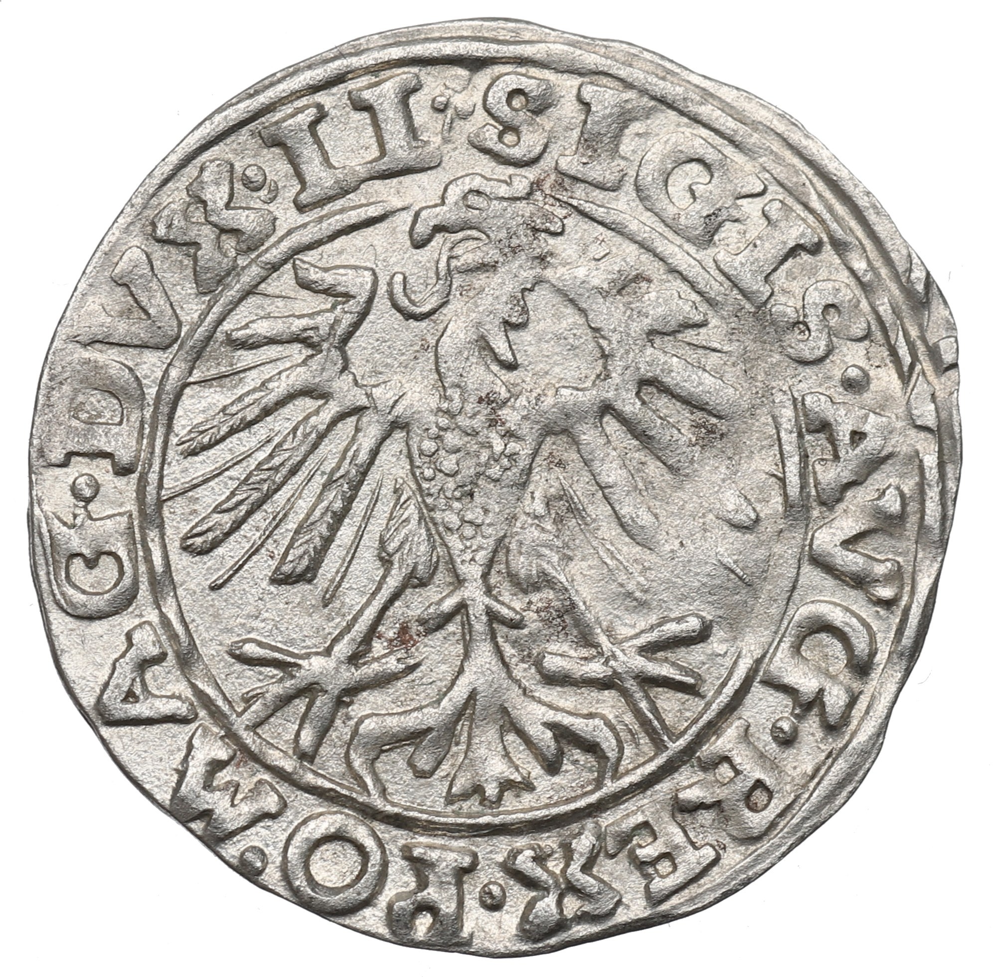 Rewers: w otoku sznurowym Pogoń w lewo, pod nią data 1557, w otoku zewnętrznym legenda przedzielona trójlistkami:
