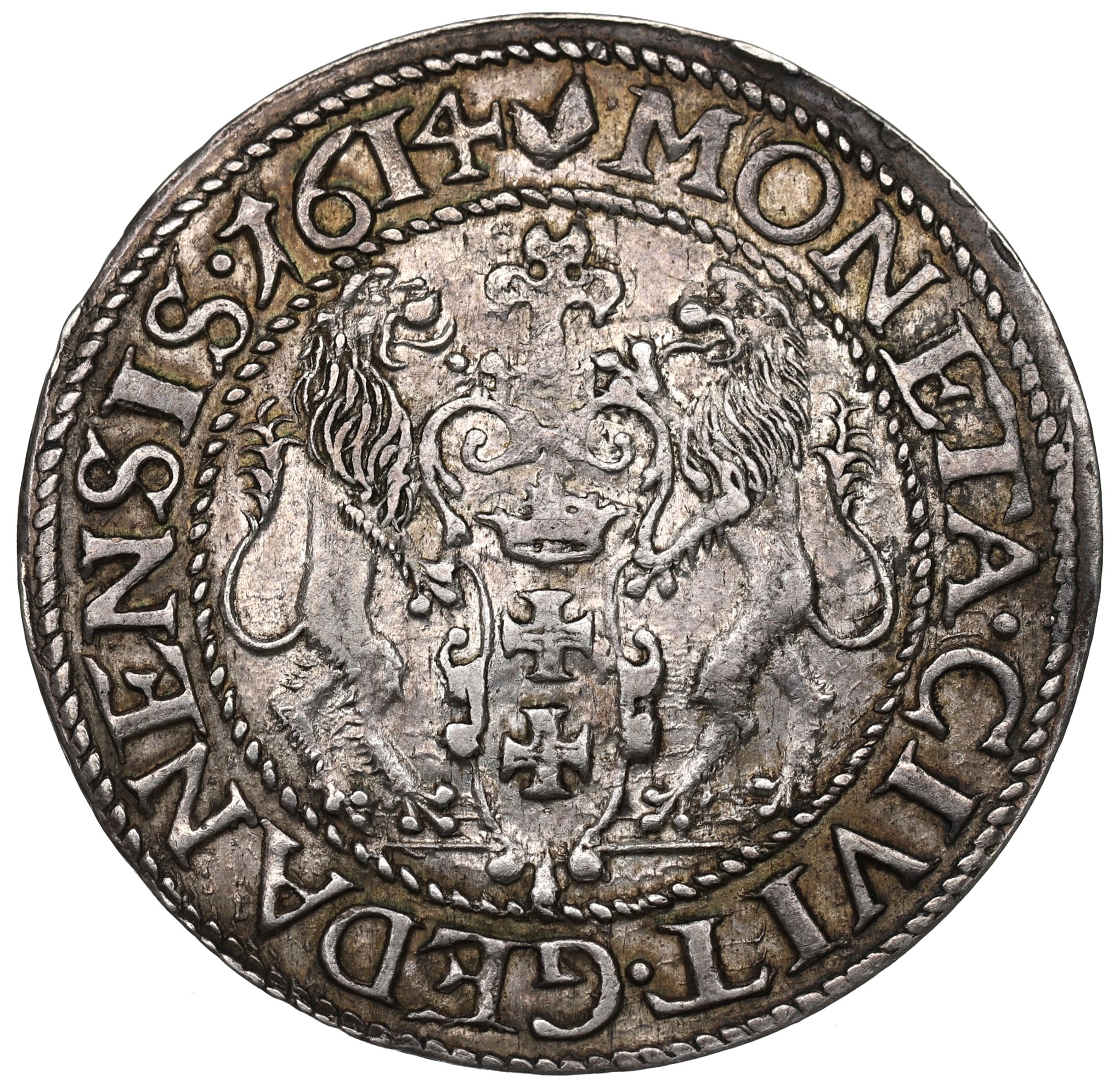 Awers: herb Gdańska w kartuszu podtrzymywanym przez dwa lwy, w otoku sznurowym, w otoku zewnętrznym legenda rozpoczynająca się od znaku Łapa niedźwiedzia i kropki: