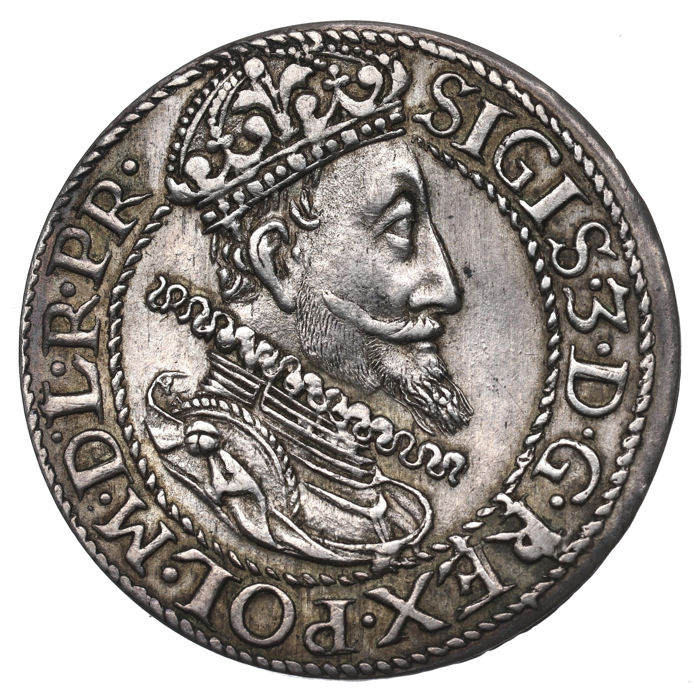 Rewers: popiersie Zygmunta III Wazy w koronie w prawo, w zbroi i płaszczu spiętym klejnotem, w kryzie rurkowatej, w otoku sznurowym, w otoku zewnętrznym legenda: