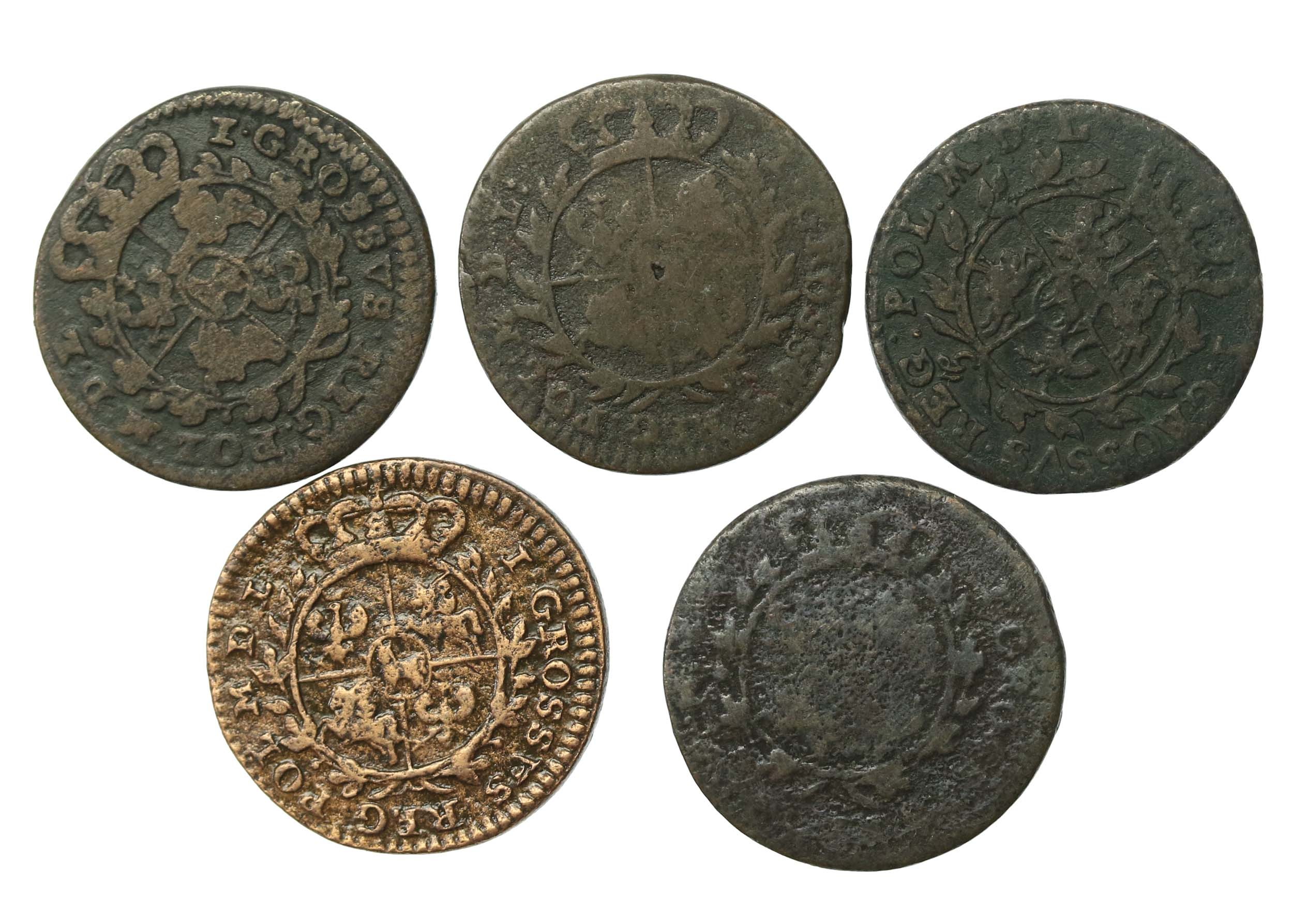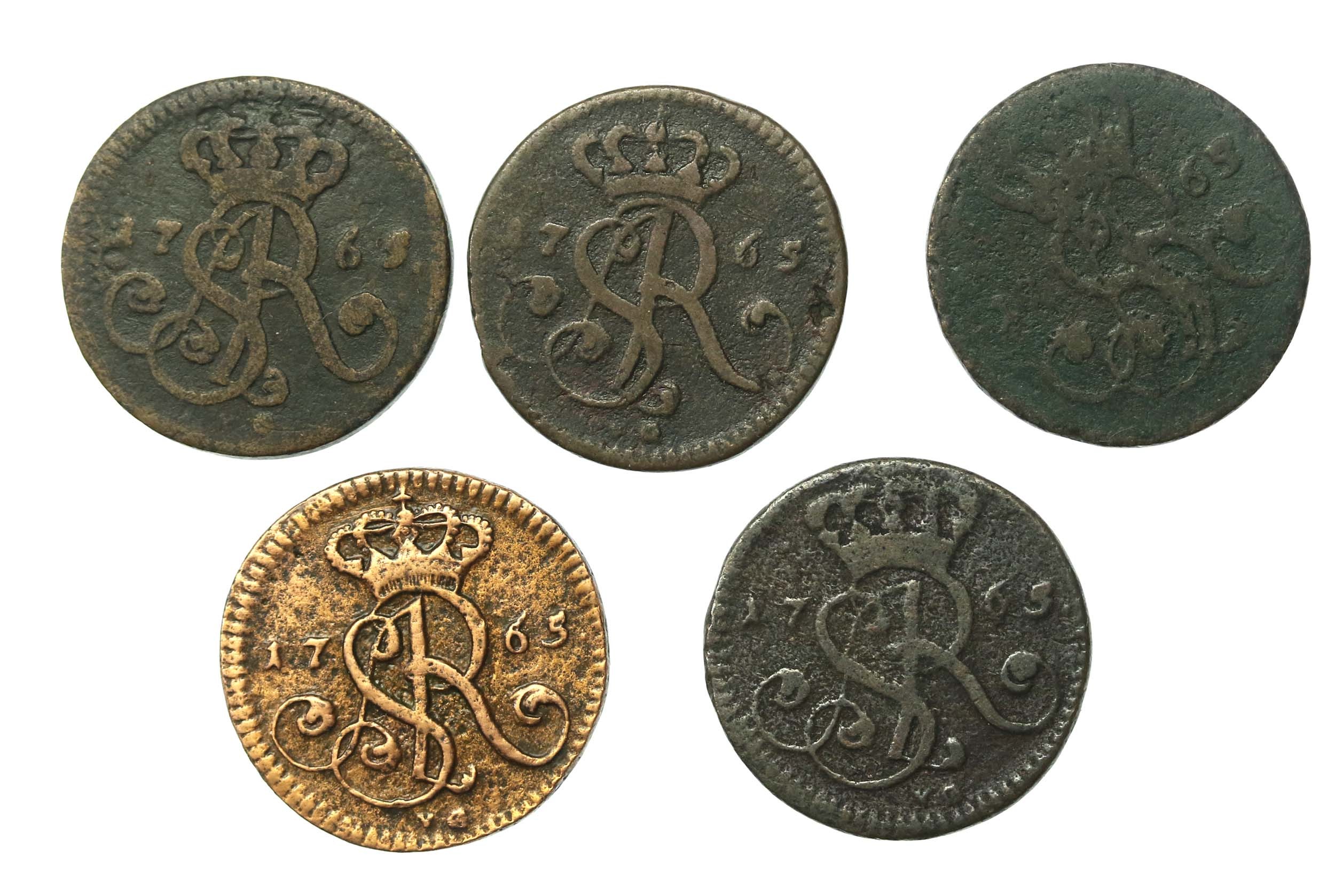 Stanisław August Poniatowski, zestaw grosze koronnych w tym 1765 VG, Warszawa. Razem 5 sztuk. Stan zachowania 3+/3, poprawnie wybite monety