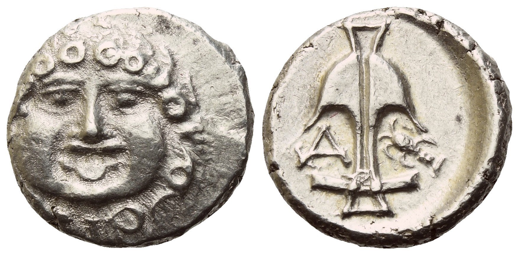 Facing gorgoneion; Rv. Upright anchor; A to l., crayfish to right. SNG BMC Black Sea 157; HGC 3.2, 1323. SNG Copenhagen 452. VF