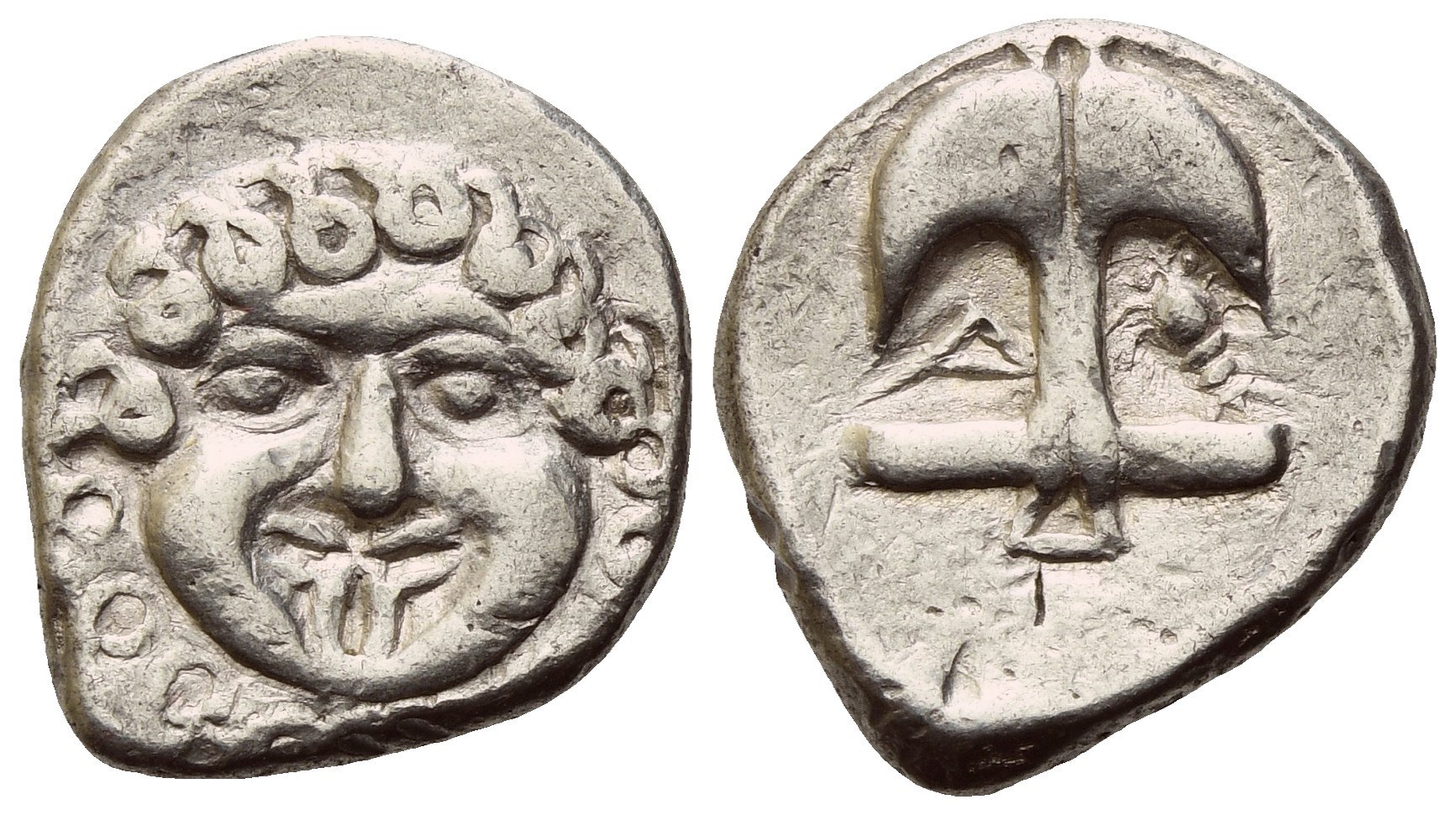 Facing gorgoneion; Rv. Upright anchor; A to l., crayfish to right. SNG BMC Black Sea 157; HGC 3.2, 1323. SNG Copenhagen 452. VF