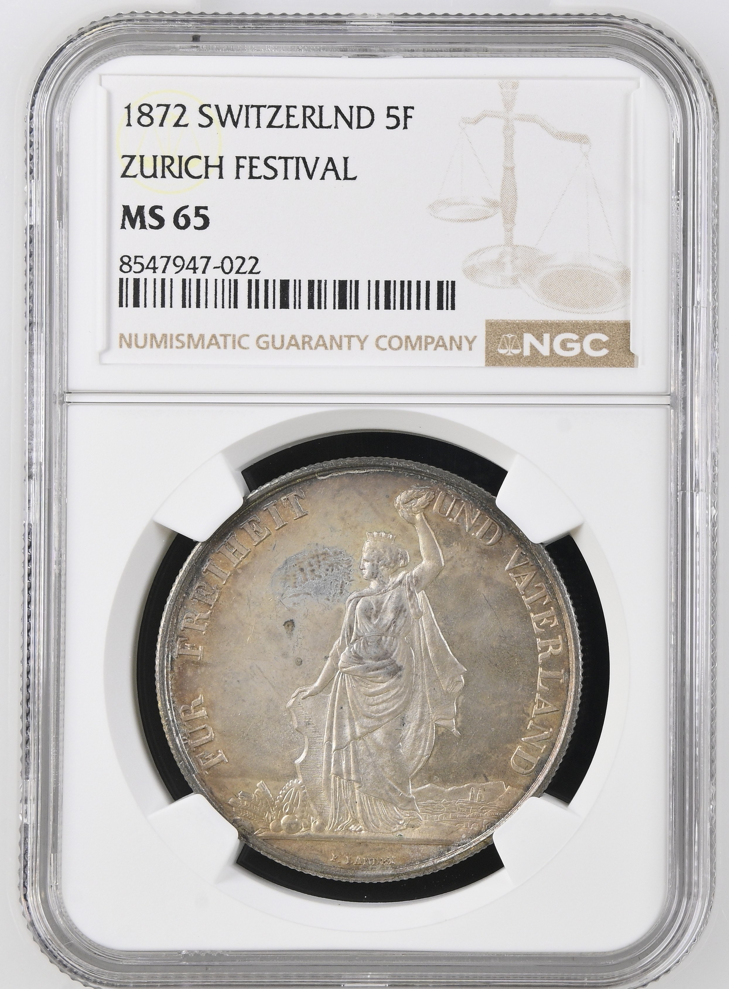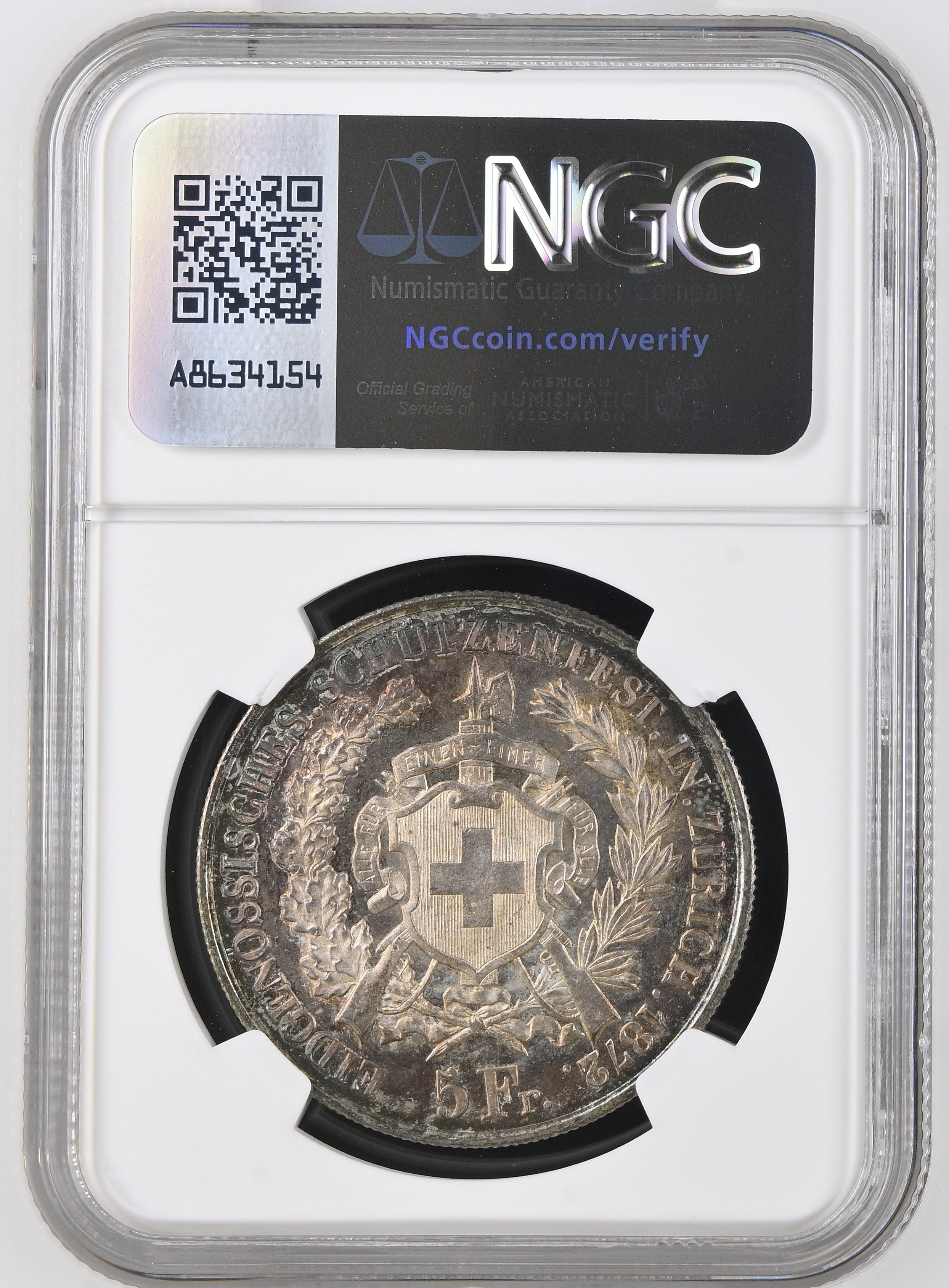 Schweiz - Zürich - 5 Franken 1872, Schützentaler - Zürich, Eidgenössisches Schützenfest - NGC MS 65 - Switzerland, 5 Francs Swiss Shooting Thaler