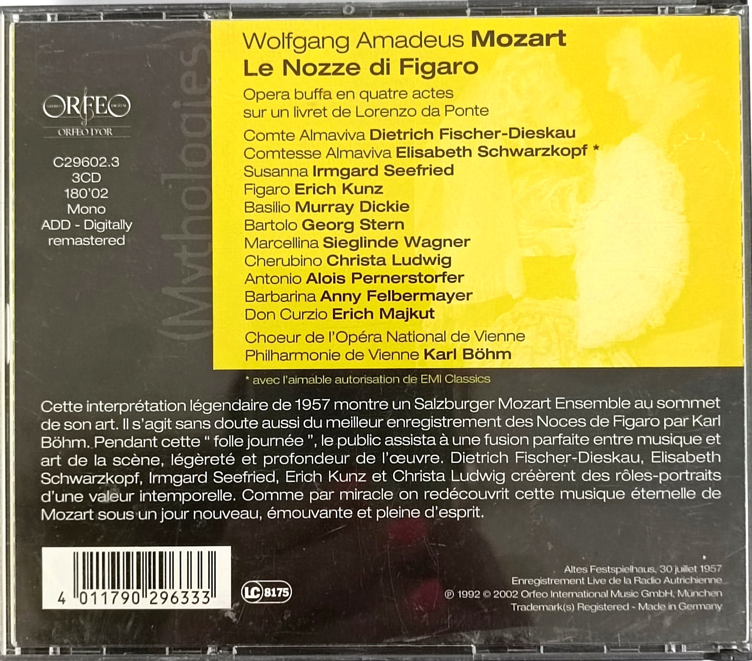 Legendarna wersja Wesela Figara, uznawana za jedną z najlepszych na świecie. Nagranie zrealizowano podczas przedstawienia na żywo, 30 lipca 1957 r., wersja zremasterowana. W komplecie 3 płyty CD oraz książeczka (po angielsku i niemiecku).
