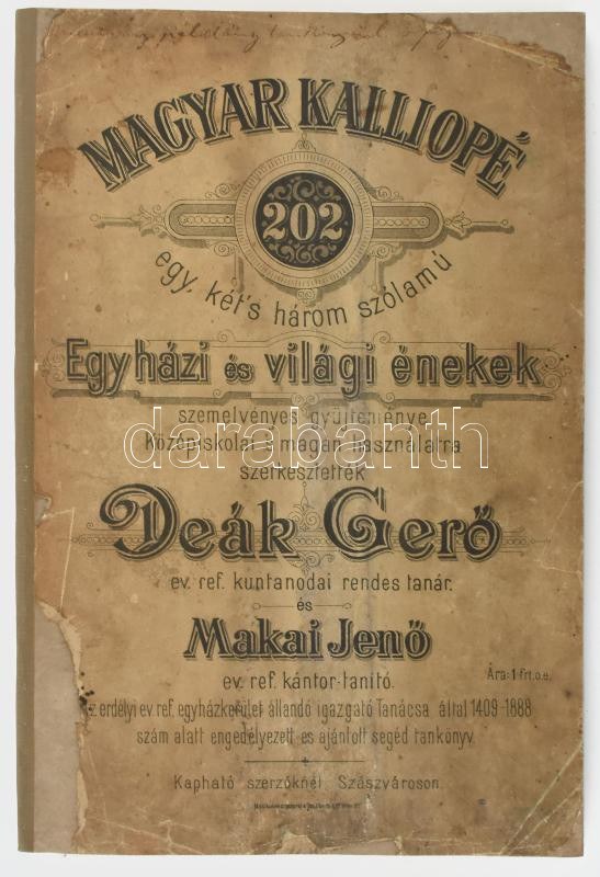 Mayar Kalliopé. 202 egy, két 's három szólamú egyházi és világi énekek szemelvények gyűjteménye középiskolai 's magán használatra. Szerk.: Deák Gerő ev. ref. kuntanodai rendes tanár és Makai Jenő ev. ref. kántor tanító. Szászváros, 1888, Szerzői, (Wien, Jos. Eberle-ny.),135+IV+1 p. Félvászon-kötés, restaurált borítóval és néhány lapon apróbb restaurációval.