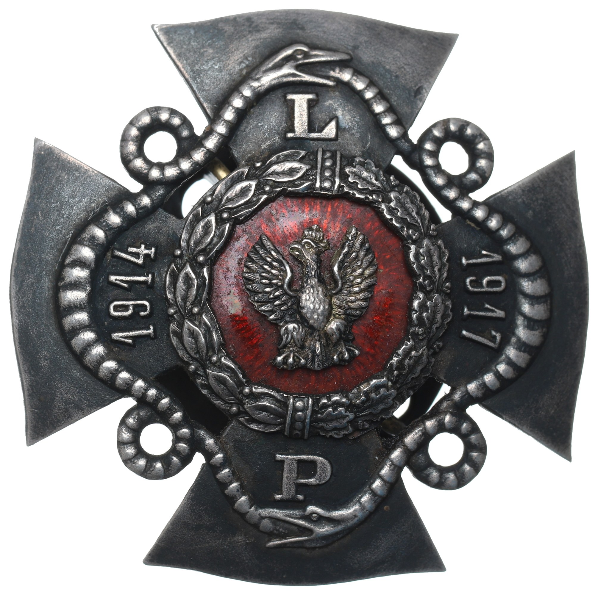 Lico: krzyż z centralnie posadzonym medalionem czerwonym z orłem, okolonym wieńcem laurowo-dębowym; na ramionach krzyża L P 1914 1917 otoczone przez dwa zjadające się węże.