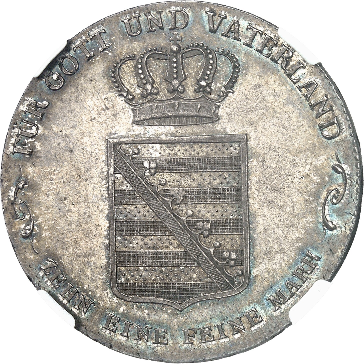 Rv. (à 10 h) FÜR GOTT UND VATERLAND / ZEHN EINE FEINE MARK. Écu de Saxe couronné.