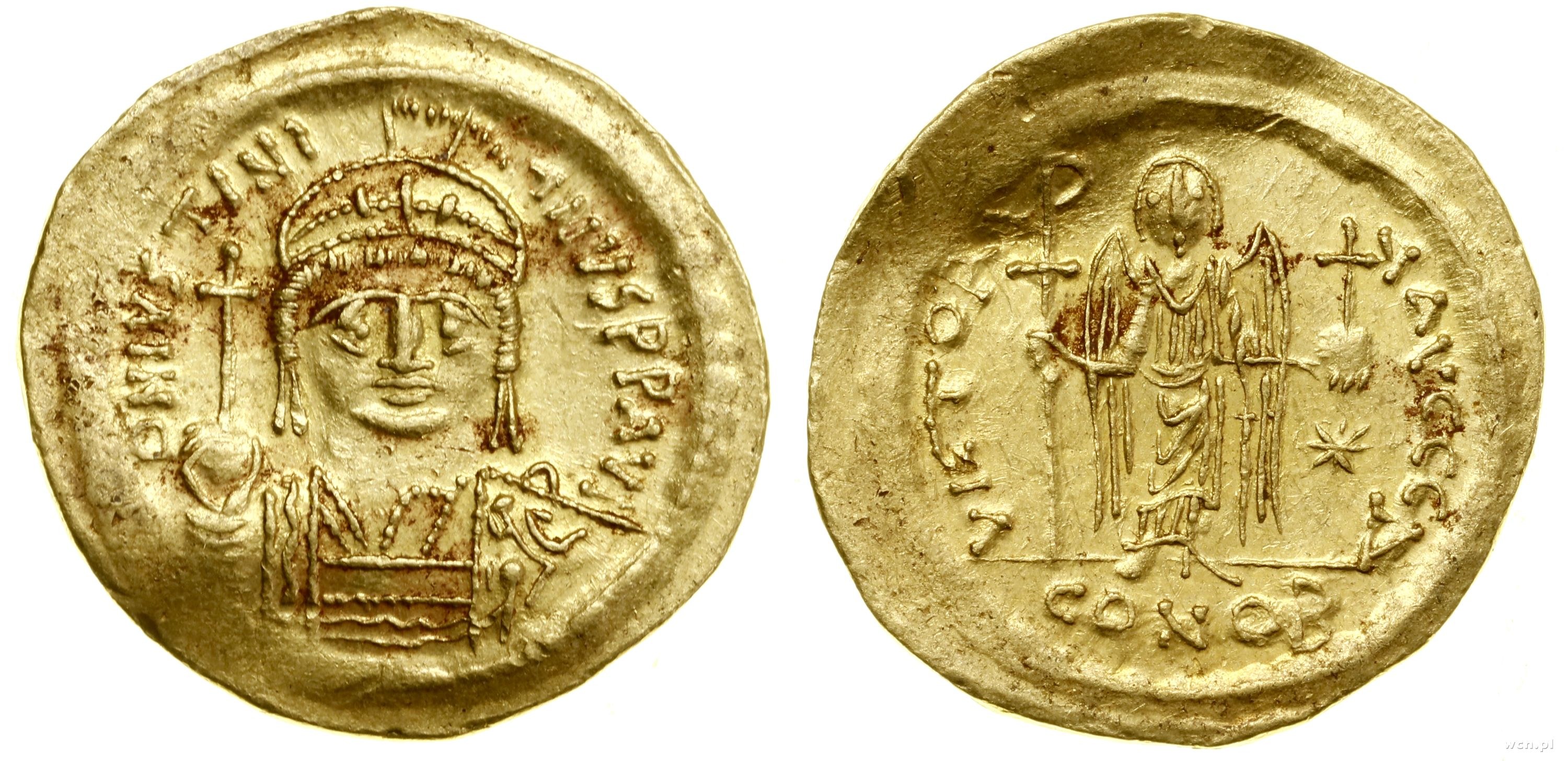 Aw: Popiersie cesarza na wprost, D N IVSTINIANVS P P AVG; Rw: Anioł na wprost z krzyżem i globem, z prawej gwiazda, VICTORIA AVGGG, oficyna Δ, u dołu CONOB