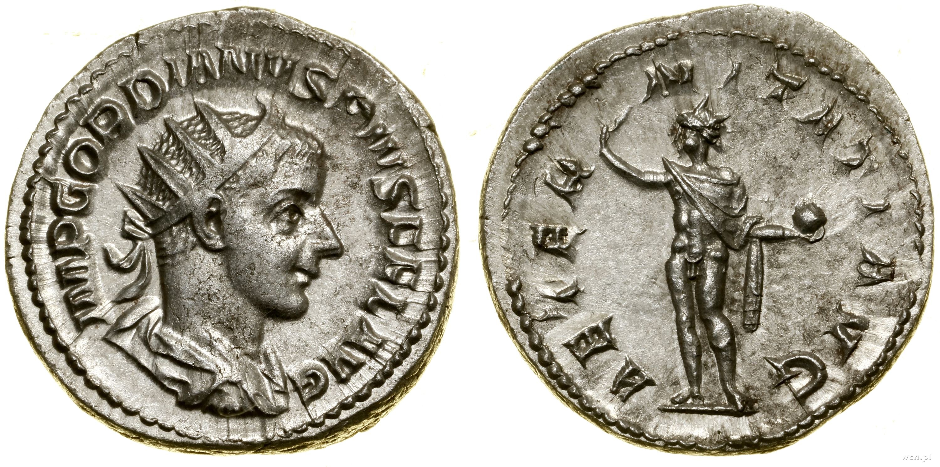 Aw: Popiersie cesarza w koronie radialnej w prawo, IMP GORDIANVS PIVS FEL AVG, Rw: Sol stojący na wprost, trzymający glob, z uniesioną ręką, AETERNITATI AVG