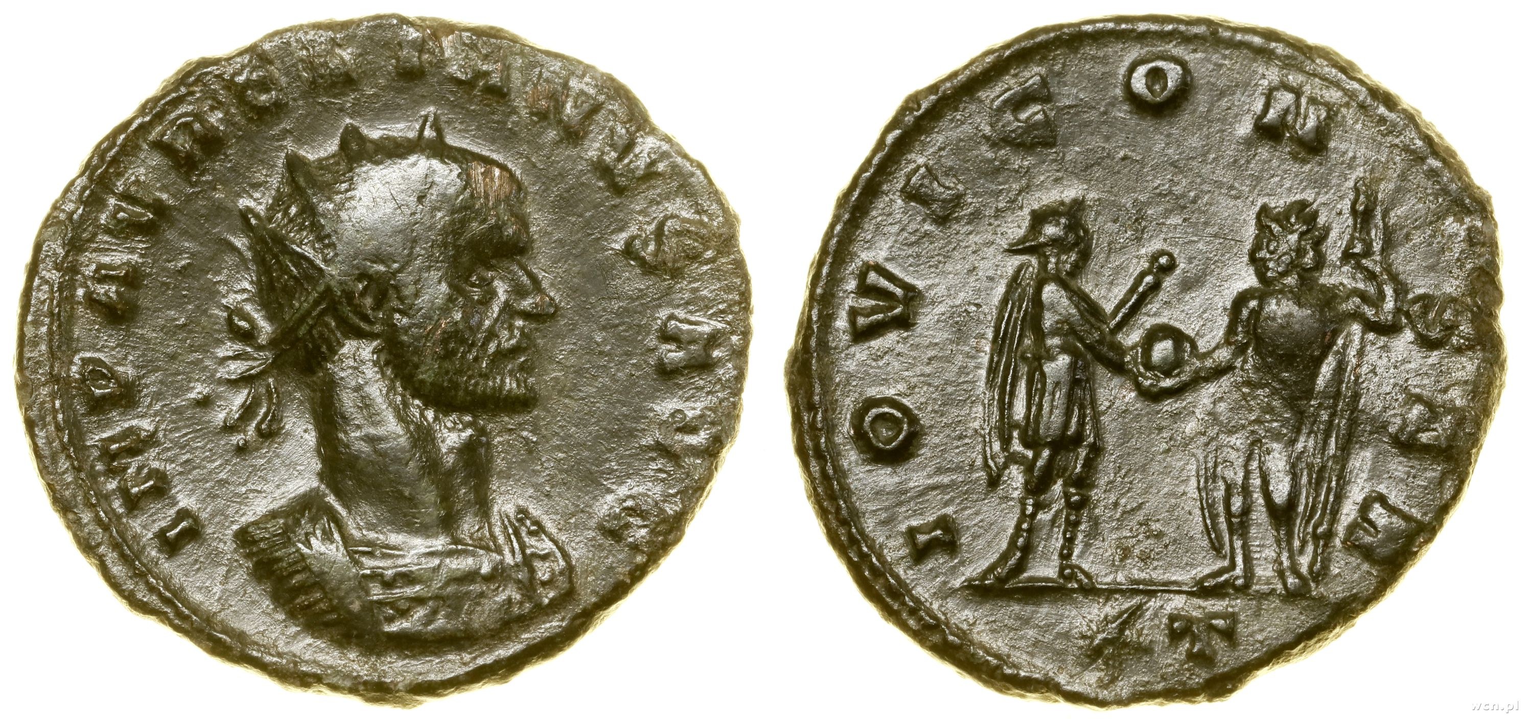 Aw: Popiersie w koronie radialnej w prawo, IMP AVRELIANVS AVG, Rw: Cesarz stojący w prawo, otrzymujący glob od stojącego naprzeciw Jowisza, IOVI CONSER, w odcinku *T