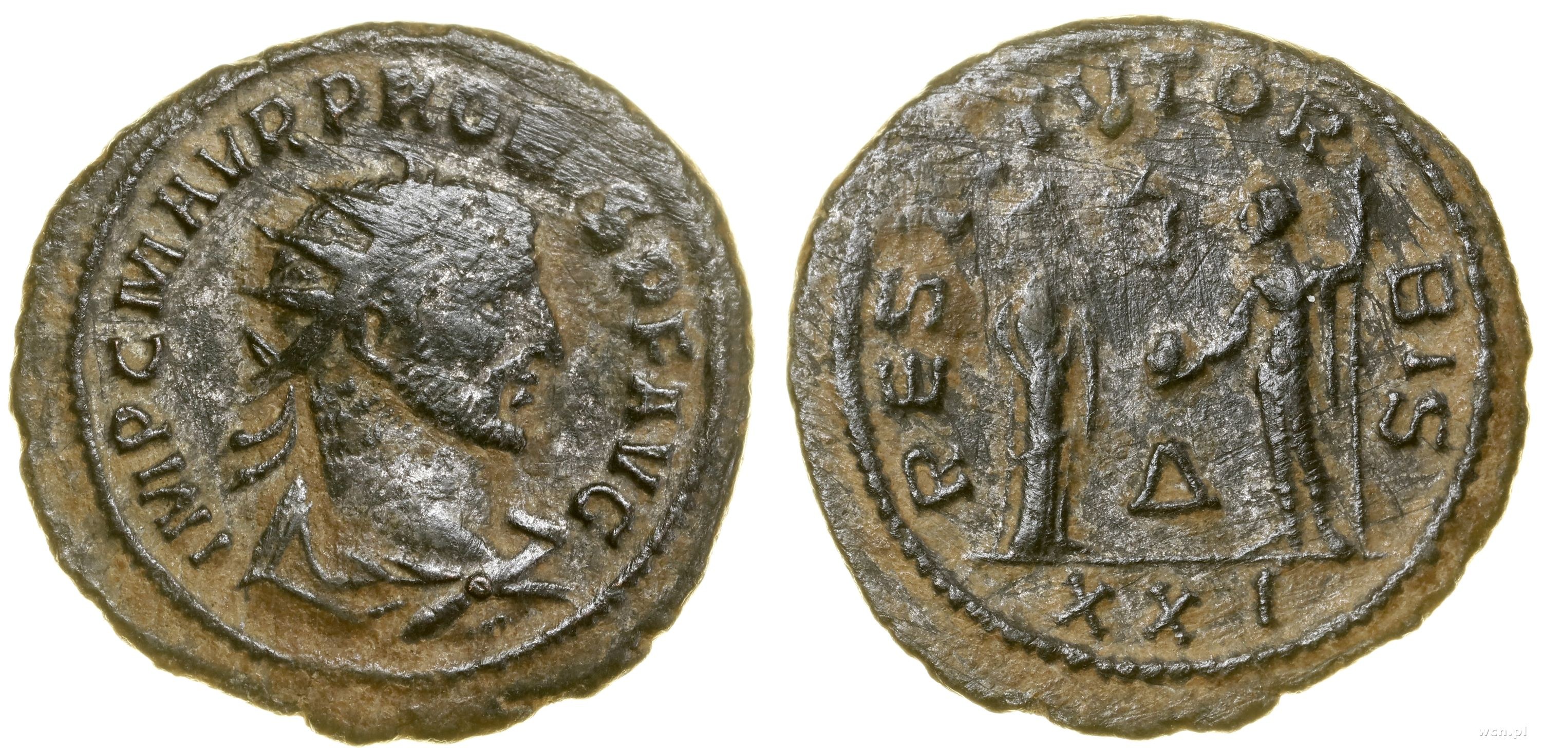 Aw: Popiersie w prawo, IMP C M AVR PROBVS P F AVG, Rw: Kobieta stojąca w prawo, nakładająca wieniec na głowę cesarza stojącego naprzeciw, trzymającego glob i berło, RESTITVT ORBIS, u dołu Δ, w odcinku XXI