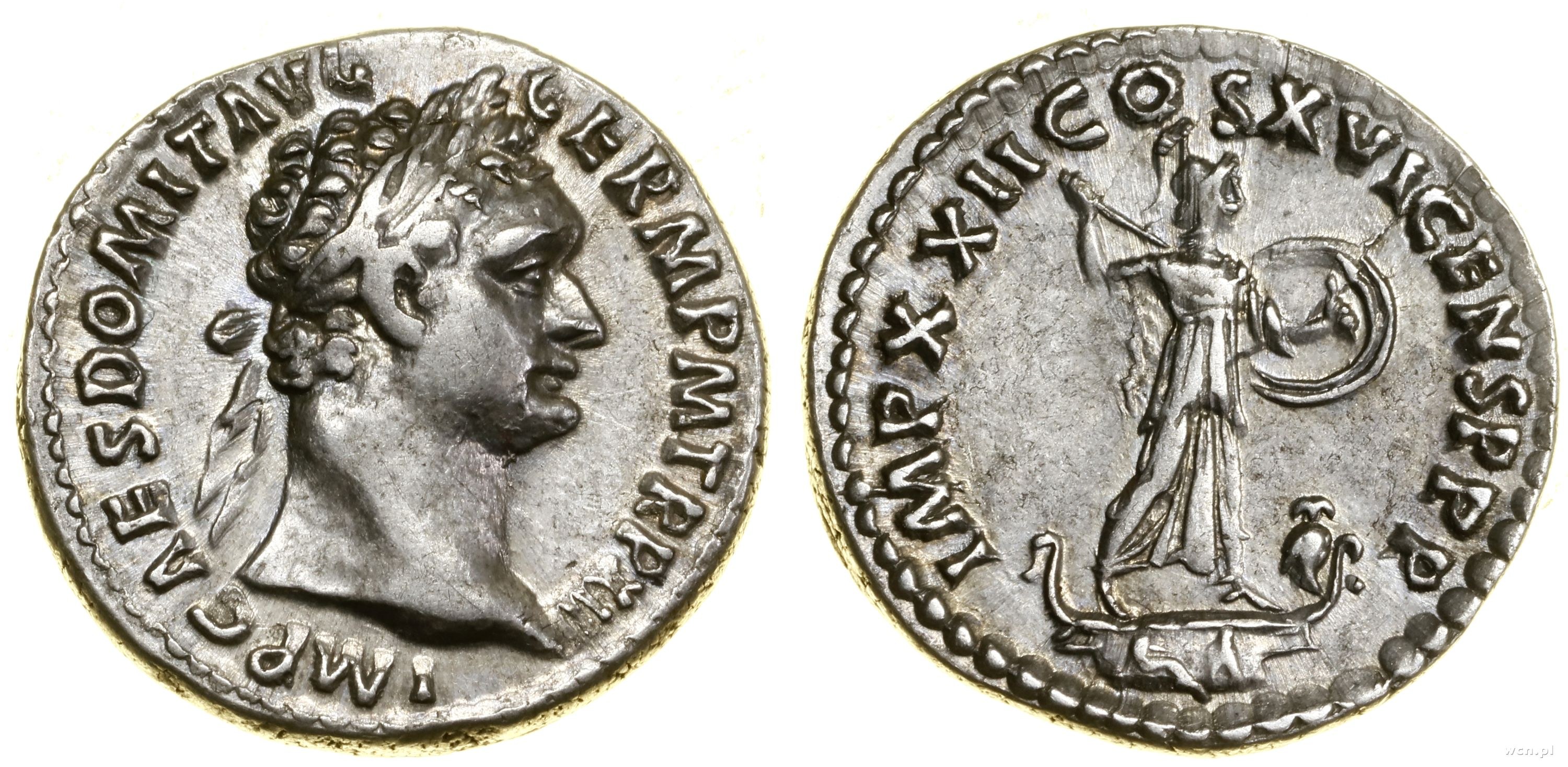 Aw: Głowa Domicjana w wieńcu laurowym w prawo, legenda IMP CAES DOMIT AVG GERM P M TR P XIII, Rw: Minerwa stojąca na szczycie kolumny w prawo, trzymająca tarczę i rzucająca oszczepem, u stóp sowa, IMP XXII COS XVI CENS P P P