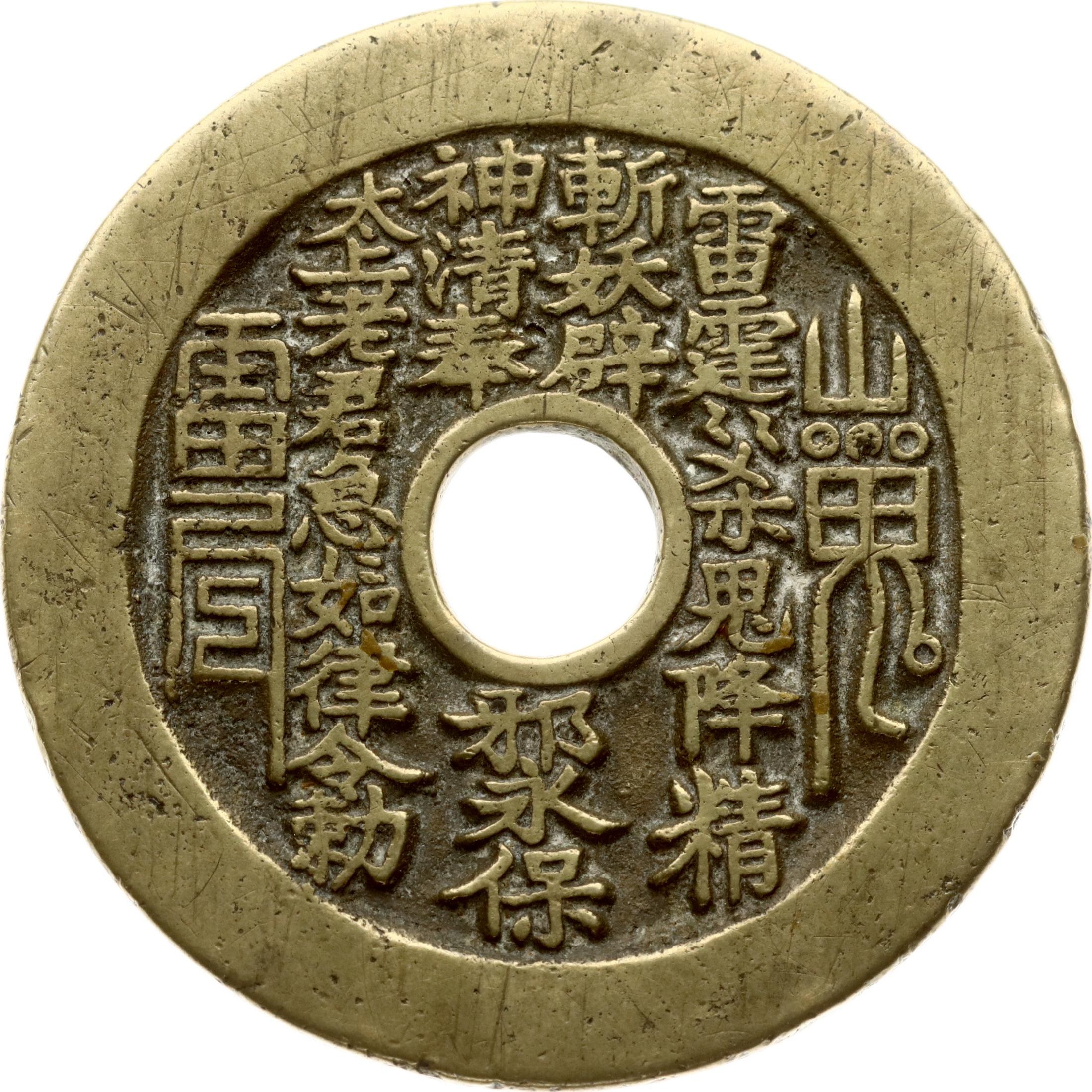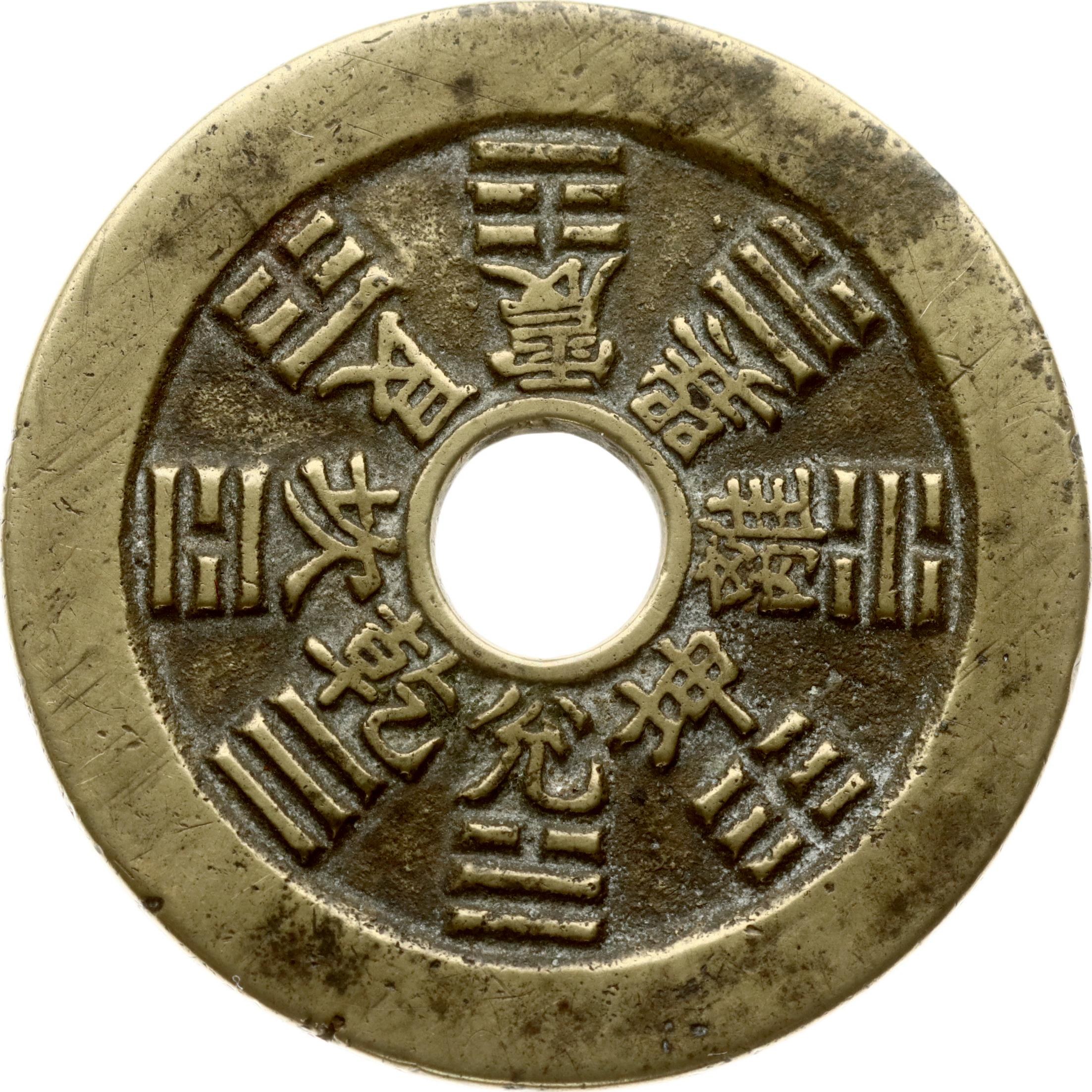 China. Amulet ND (19th century). Cast brass to protect against danger. On the left and right there are magical signs in old seal script, in the middle in translation: 'May the God of Thunder destroy the demons and give us security .... Order of Lao Tsu'. Rev: The 8 trigrams of Emperor Fu-Hsi (symbols of 8 elements = Chinese I-Ying). Schjöth 92. Patalas Tf. 46 C/D. Kainz. Chinese temple coins. Brass 44 mm, 18.82 g.