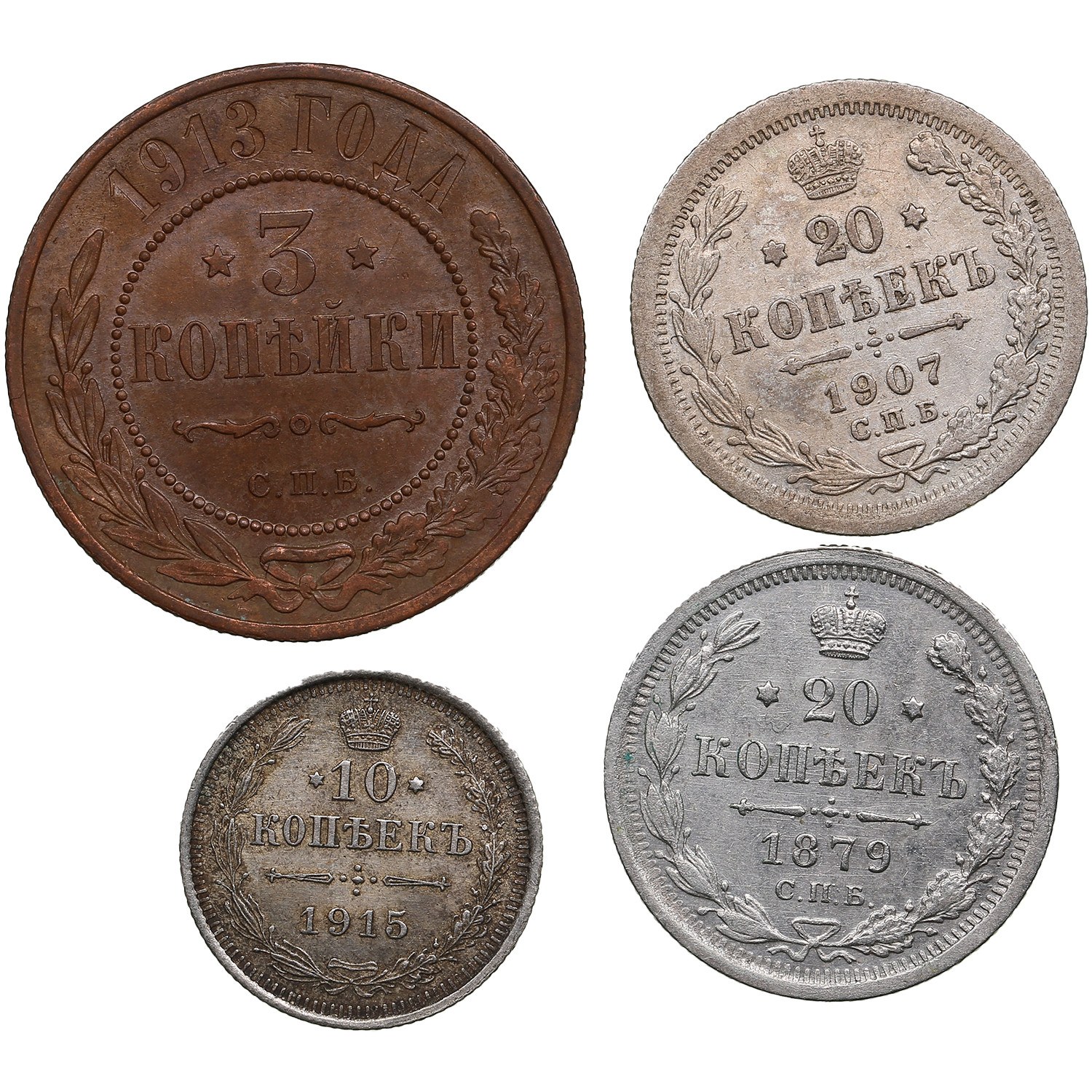 Various condition. Included: 3 Kopecks 1913, 10 Kopecks 1915, 20 Kopecks 1879, 1907.