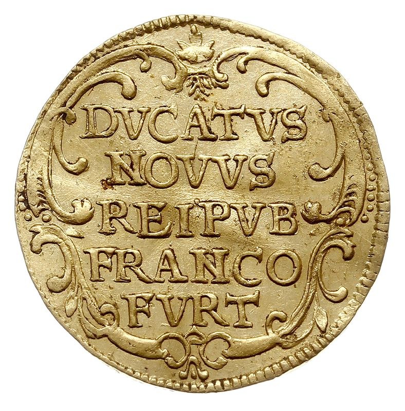 Frankfurt - miasto, dukat 1648, złoto 3.42 g, Fr. 976, Joseph/Fellner 456, lekko gięty, ale piękny