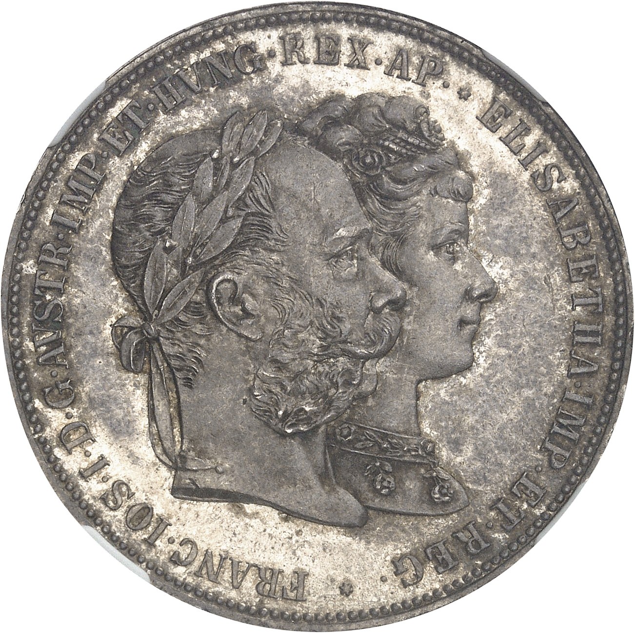 Av. * FRANC. IOS. I. D. G. AVSTR. IMP. ET. HVNG. REX. AP. * ELISABETHA. IMP. ET. REG. Têtes accolées à droite de François-Joseph Ier, lauré, et d'Élisabeth, diadémée.