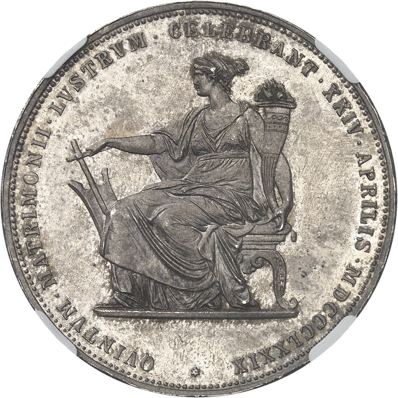 Rv. * QVINTVM. MATRIMONII. LVSTRVM. CELEBRANT. XXIV. APRILIS. MDCCCLXXIX. Allégorie assise à gauche tenant un gouvernail de la main droite et une corne d'abondance de la main gauche.