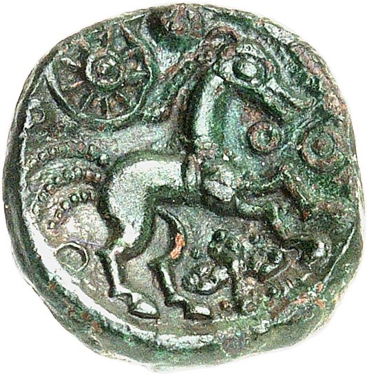 Rv. Cheval sanglé galopant à droite à la queue trifide perlée ; une roue à neuf rayons, entre deux annelets, au-dessus ; un trèfle à quatre feuilles, cantonné de quatre points au-dessous ; annelets divers.