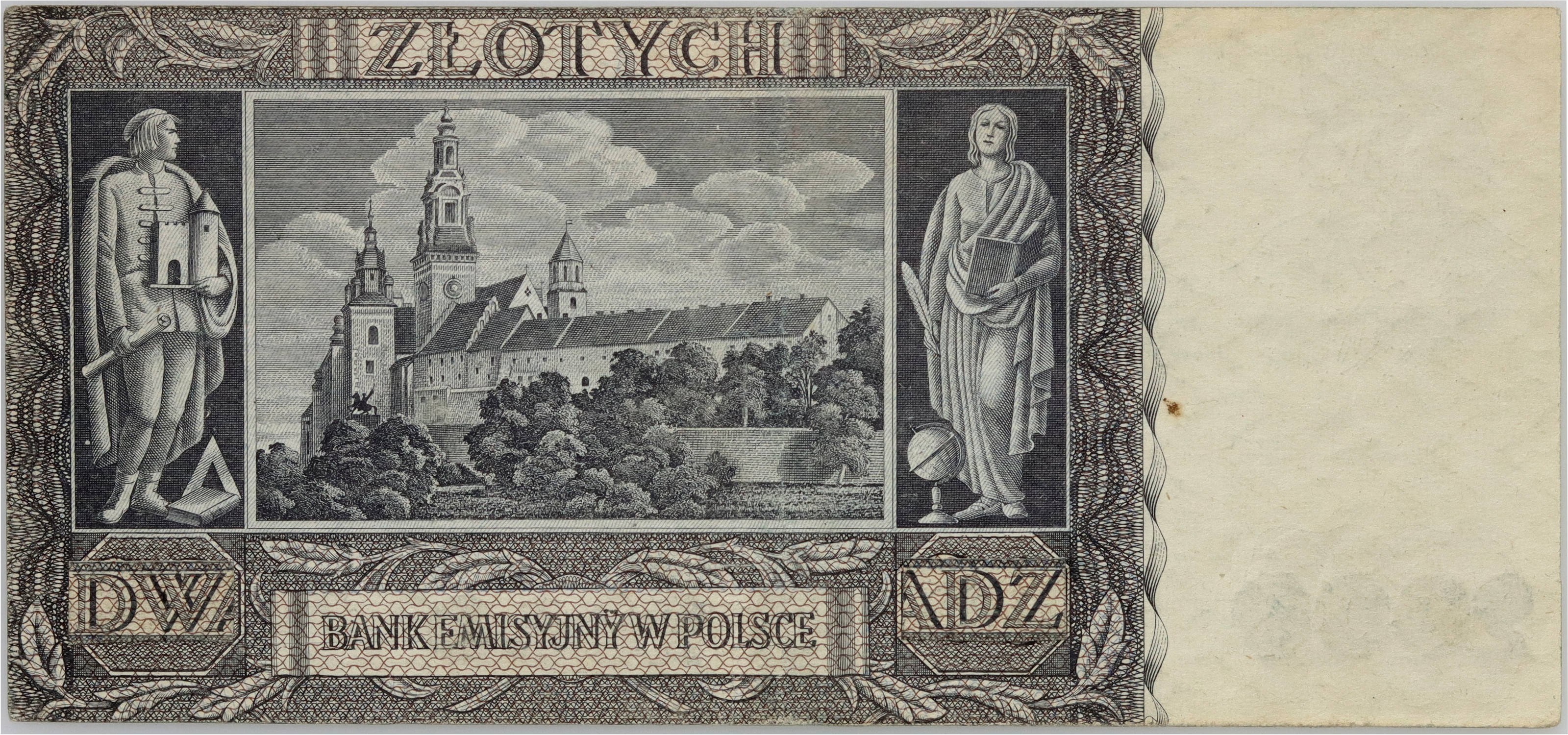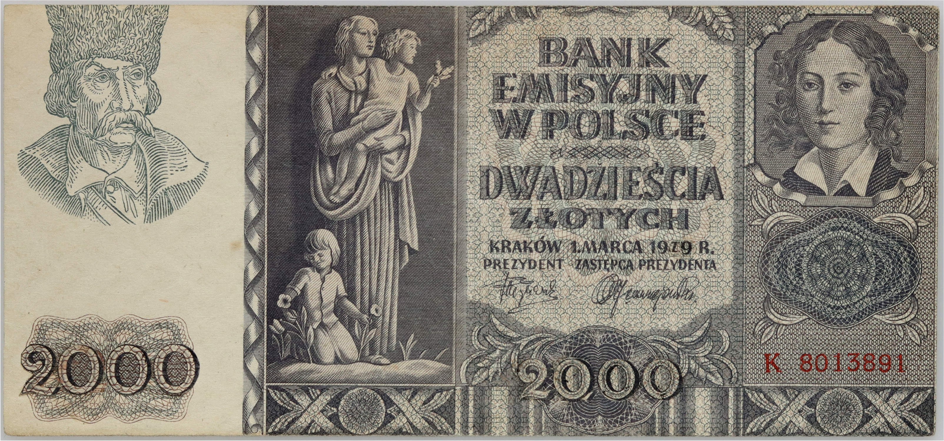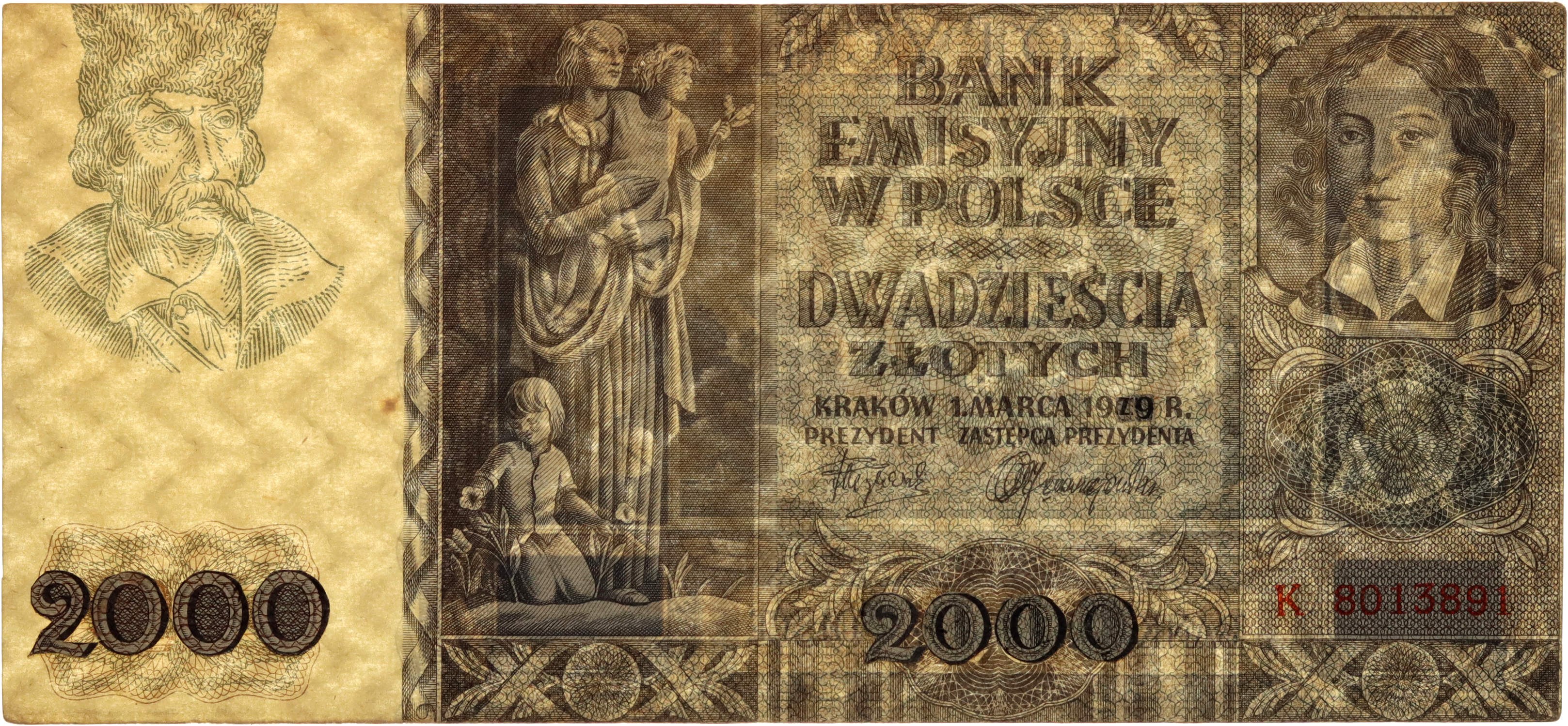 Numer 8013891. Fałszerstwo polegające na zmianie nominału z 20 złotych na 2000 złotych (cyfry są przyklejone), dodatkowo zmieniona data na 19Z9 rok (tutaj znaki również przyklejone). Banknot Przycięty. Ciekawostka do uzupełnienia zbioru GG.