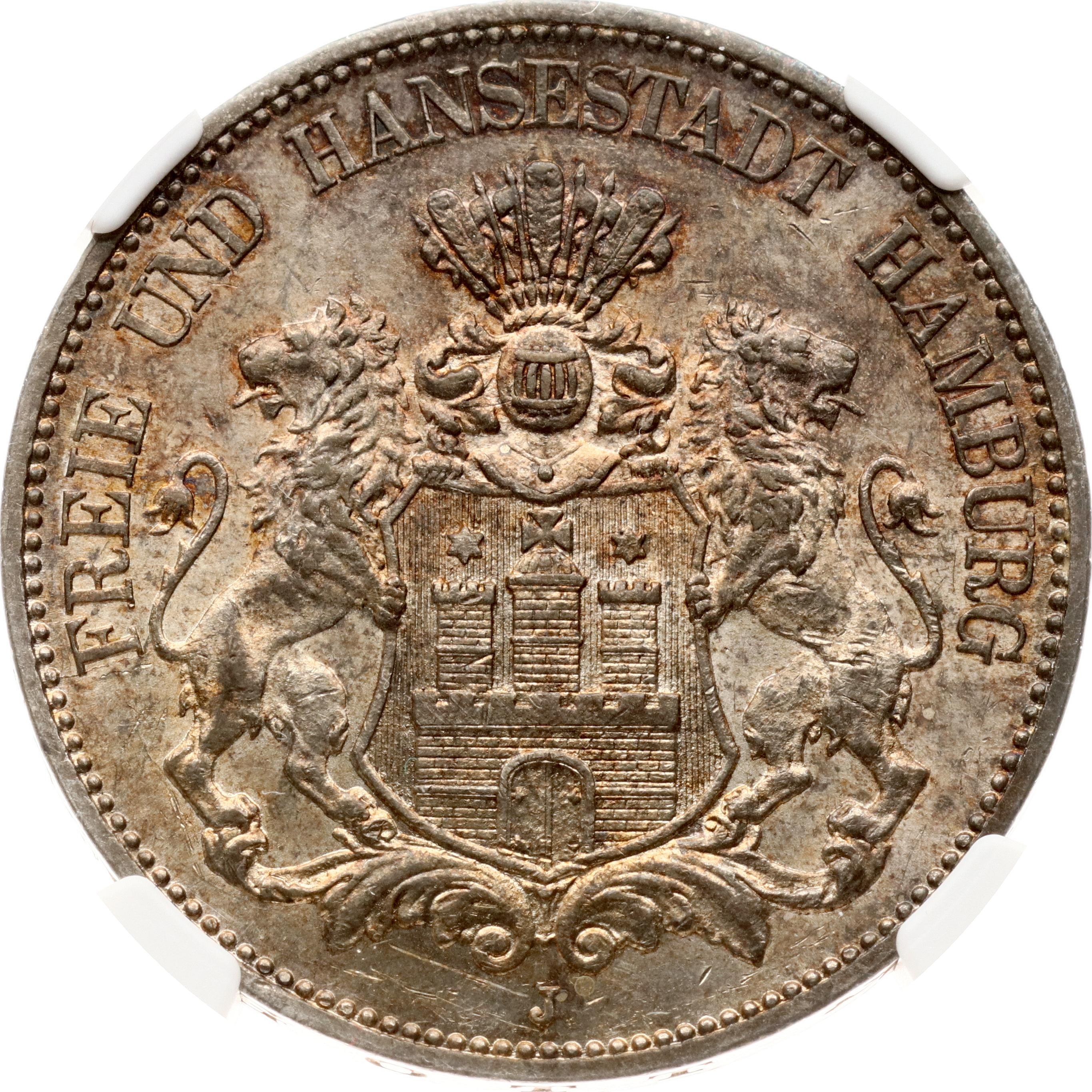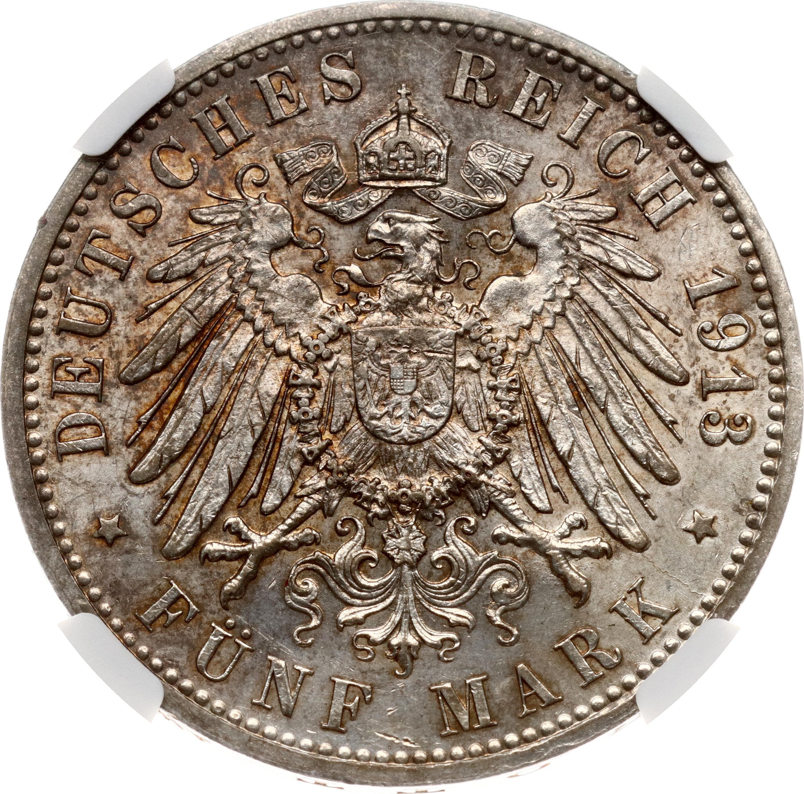 Germany Hamburg 5 Mark 1913 J NGC UNC DETAILS