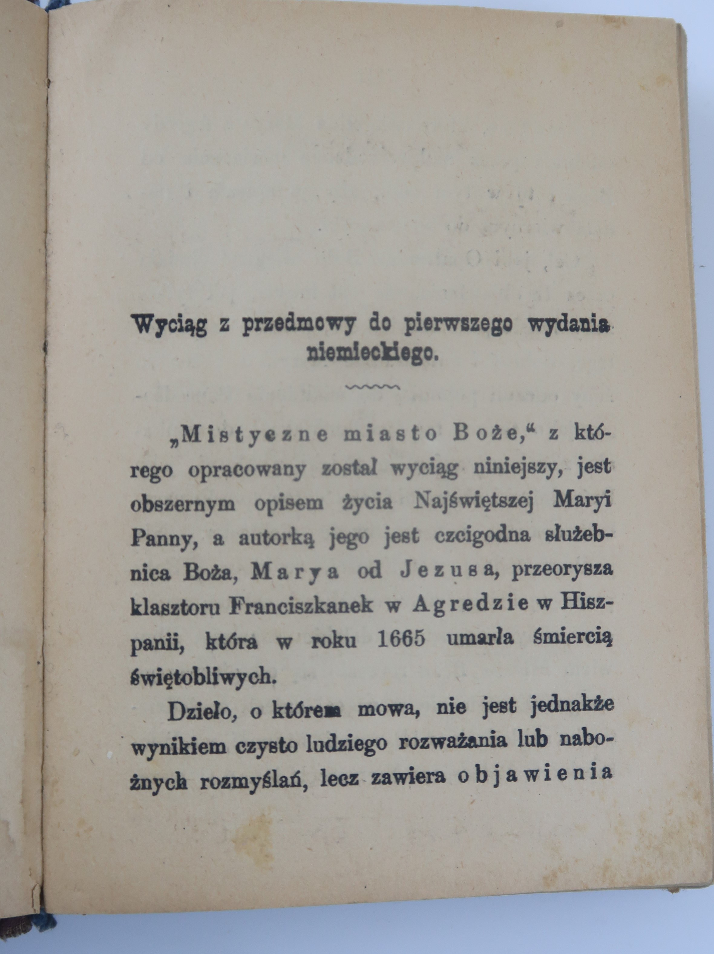 Autorka dzieła „Mistyczne Miasto Boże" czyli Marii z Agredy żyła w latach 1606 - 1665, była zakonnicą z zakonu franciszkanów w Agredzie, od 25 roku życia była opatką zakonu, w zakonie przybrała imię Maria od Jezusa. Maria z Agredy była mistyczką i wizjonerką. Po śmierci zakonnicy rozpoczął się proces beatyfikacyjny w 1673 r.